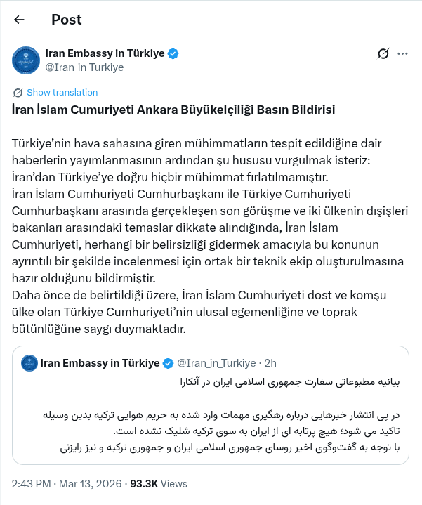 Es wurde keine Munition aus dem Iran in Richtung Türkiye abgefeuert.