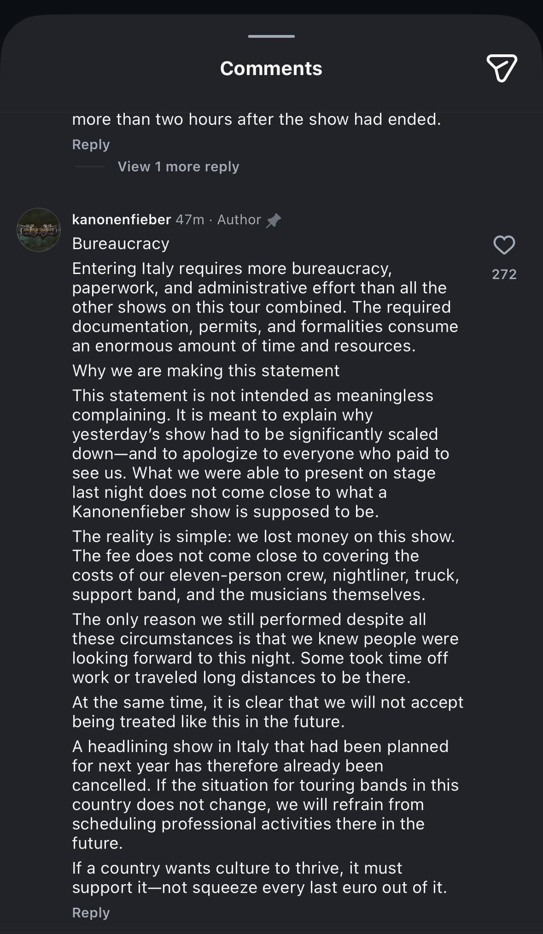 Ein für nächstes Jahr geplantes Headlinerkonzert in Italien wurde daher bereits abgesagt. Sollte sich die Situation für Tourbands in diesem Land nicht ändern, werden wir in Zukunft von der Ausübung professioneller Aktivitäten dort absehen.