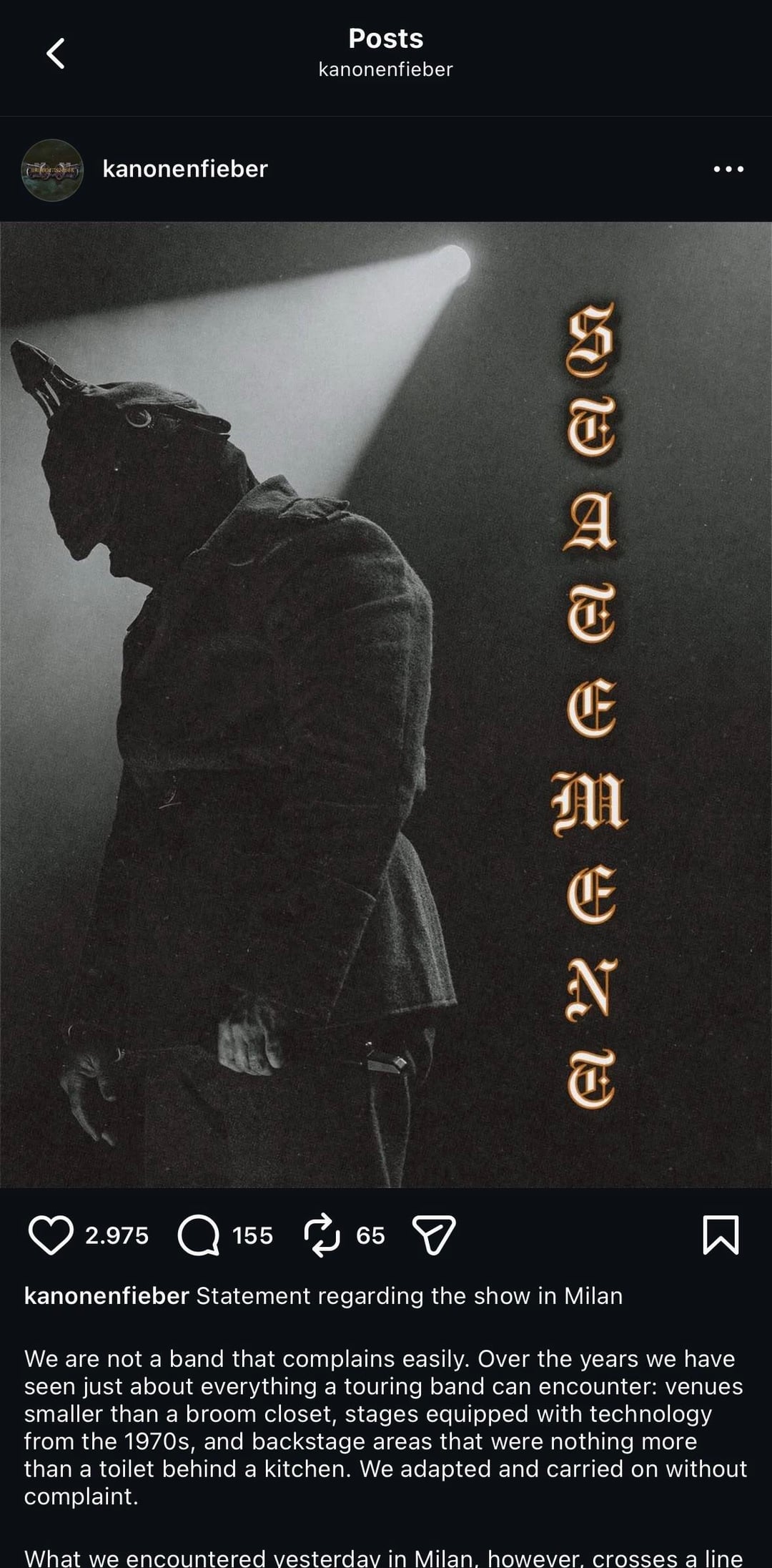 Diese Aussage stellt an sich keine Beschwerde dar. Es soll erklären, warum das gestrige Konzert erheblich reduziert werden musste – und sich bei allen entschuldigen, die dafür bezahlt haben, uns zu sehen. Was wir gestern Abend auf der Bühne präsentieren konnten, ist bei weitem nicht das, was eine Kanonenfieber-Show sein sollte.