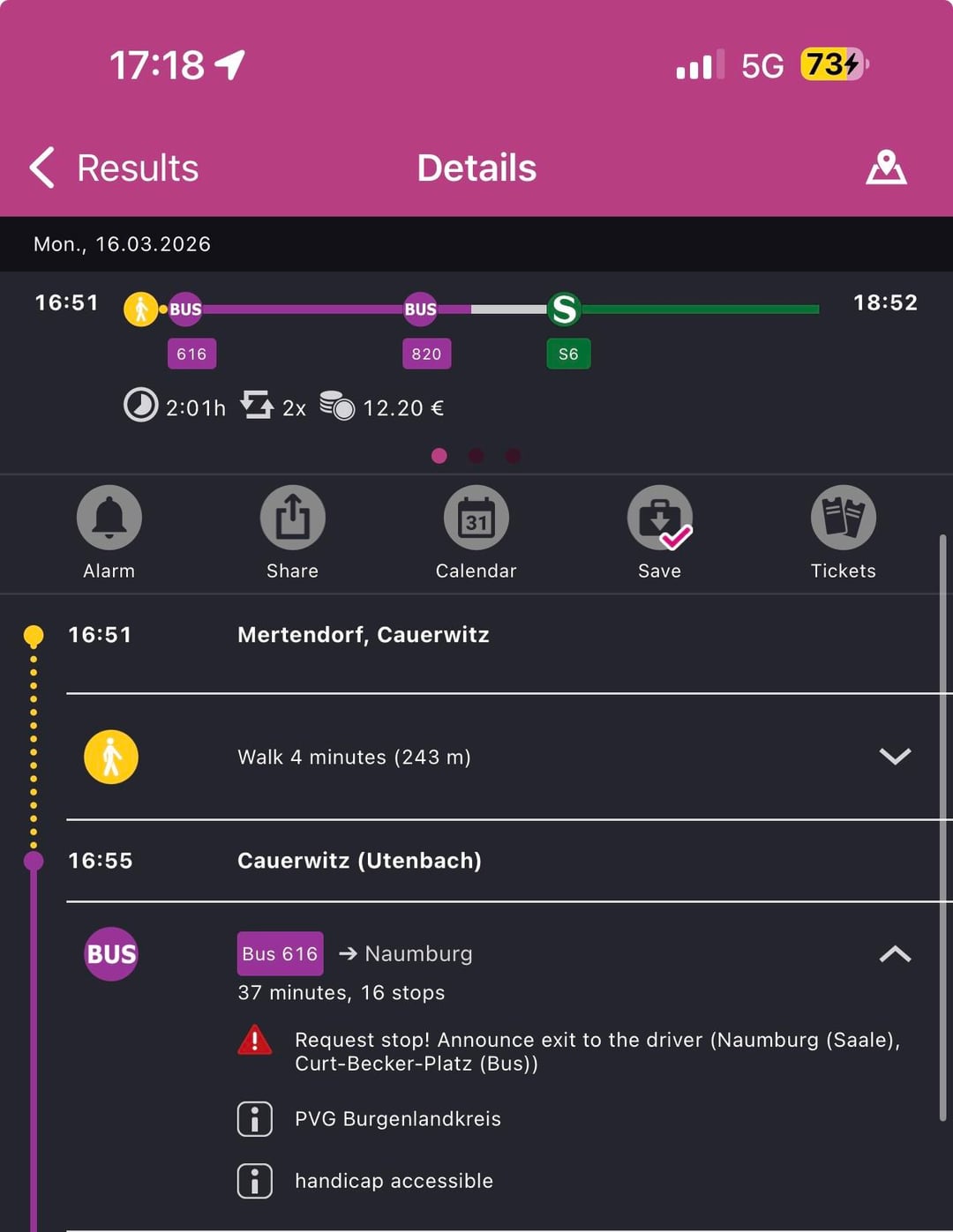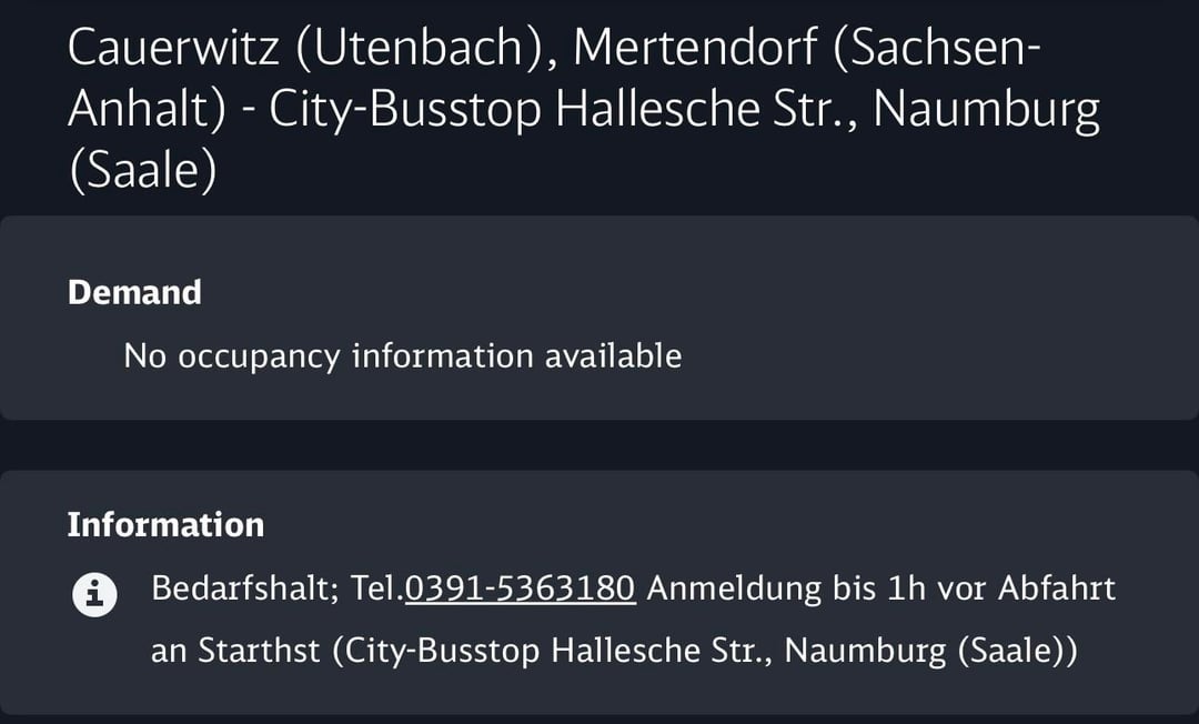 Das Bit „Halt anfordern“ ist auch das, was DB Navigator sagt, aber ich denke, dass der Teil „Ausfahrt dem Fahrer ankündigen“ seltsam ist, weil ich die Ausfahrt nicht ankündigen kann, wenn ich nie eingestiegen bin? Ich dachte nur, ich sollte es klarstellen, denn auf der Fahrt dorthin war die von INSA angezeigte Warnung dieselbe wie die von DB Navigator – dass ich sie mindestens eine Stunde vor der Abfahrt des Busses vom Startpunkt anrufen sollte.