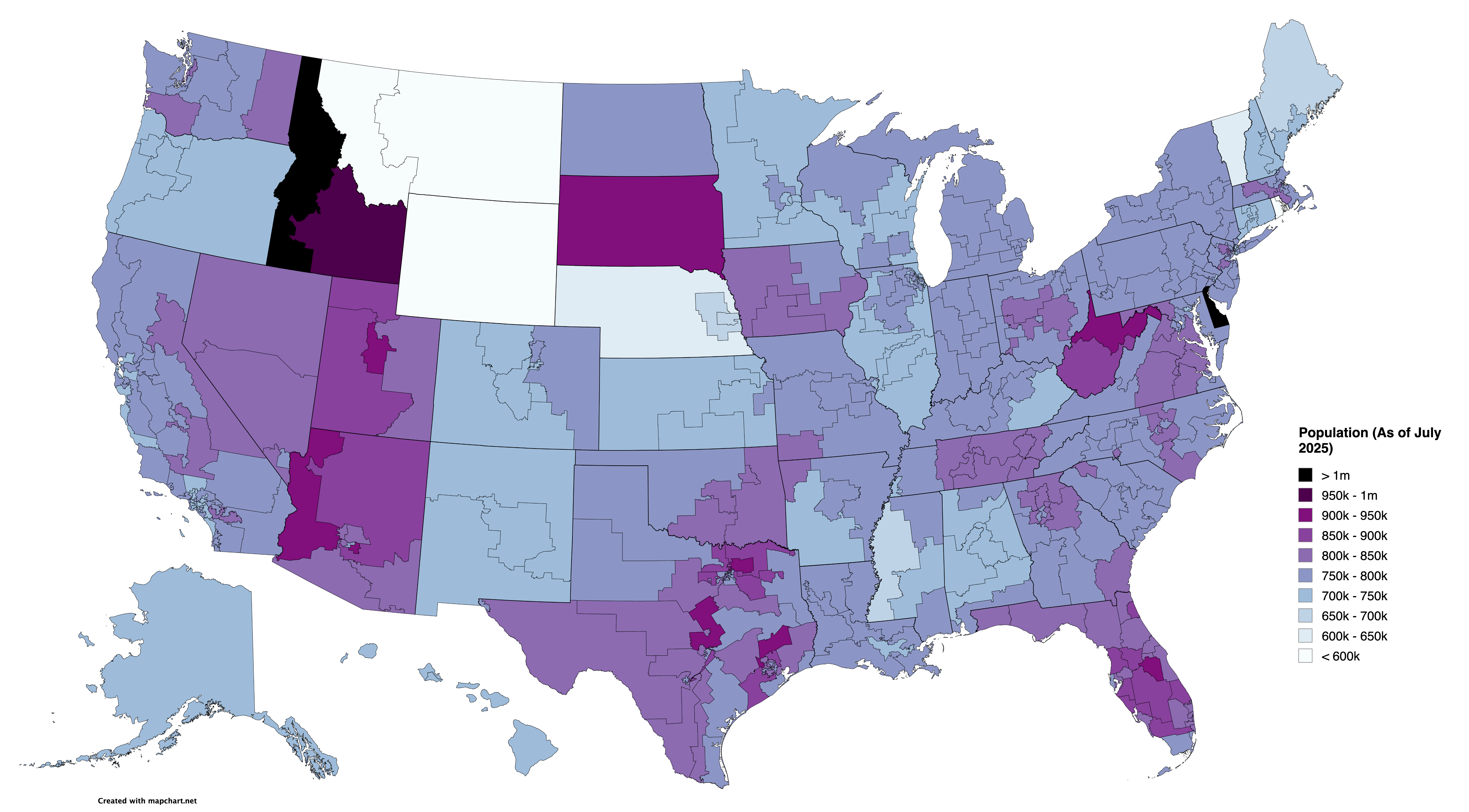 All districts within a state are supposed to have equal population. This is mandated by the Constitution as ruled by SCOTUS in [**Reynolds v. Sims**](https://www.google.com/search?client=firefox-b-1-d&q=Reynolds+v.+Sims&ved=2ahUKEwibgvSIiqGTAxUNJEQIHb0RIt4QgK4QegQIARAB) **(1964)**. Making them perfectly equal is impossible, but they should be equal within 50,000 people. That means that in most states all the districts should be the same color. In some states, where the intended population per district is near one of the population cutoffs, the districts should be two different colors. No state should have three or more colors. But on this map several states have districts of three colors.