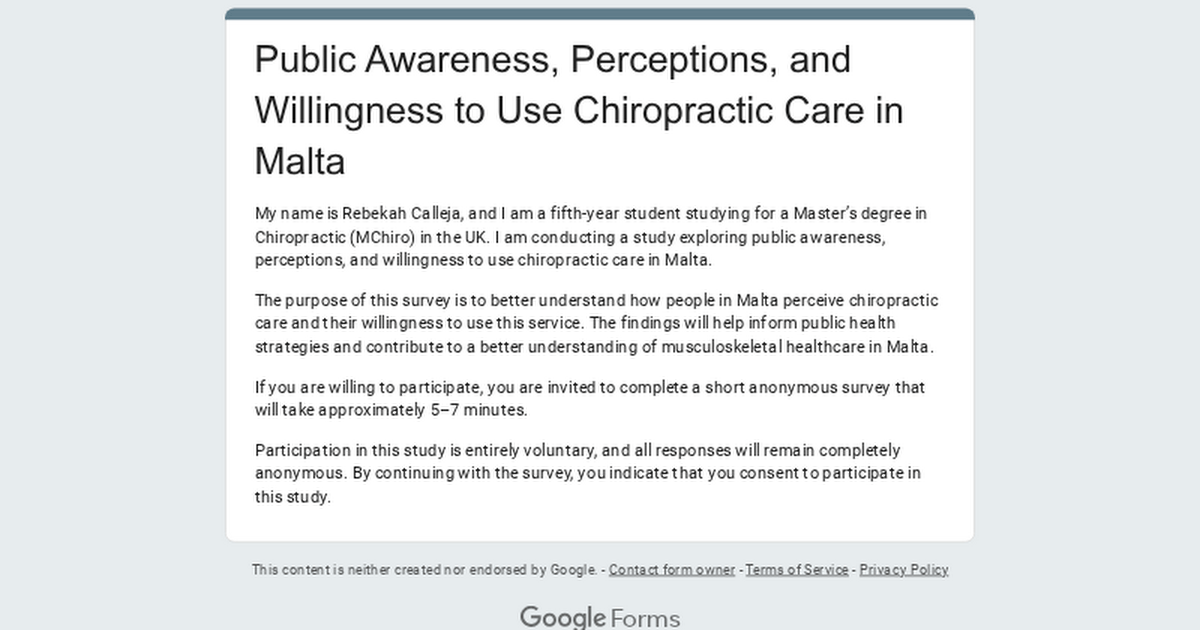 Ich mache derzeit meine Master-Forschung in Chiropraktik und sammle Antworten für eine kurze anonyme Umfrage (ca. 5–7 Minuten), um zu verstehen, wie Menschen in Malta Chiropraktik und Gesundheit des Bewegungsapparates wahrnehmen.