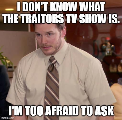 It’s a reality TV game show. I don’t watch normally watch this sort of thing but Traitors is entertaining. Sort of a more theatrical version of an extremely toxic club committee meeting.
