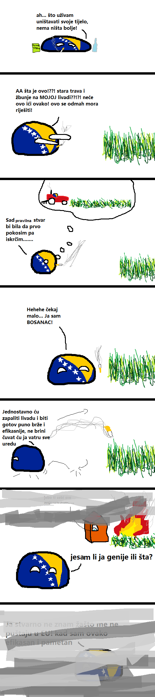 Paliti grane koje ne dime toliko bi nekako i razumio ali paliti travu koja zadimi sve okolo nikako ne razumijem. Pogotovo jer ljudi koji imaju tolike livade imaju mjesta i da odvoje 2m^(2) gdje će odložit tu travu da se kompostira pa da sljedeće godine imaju besplatno gnojivo.