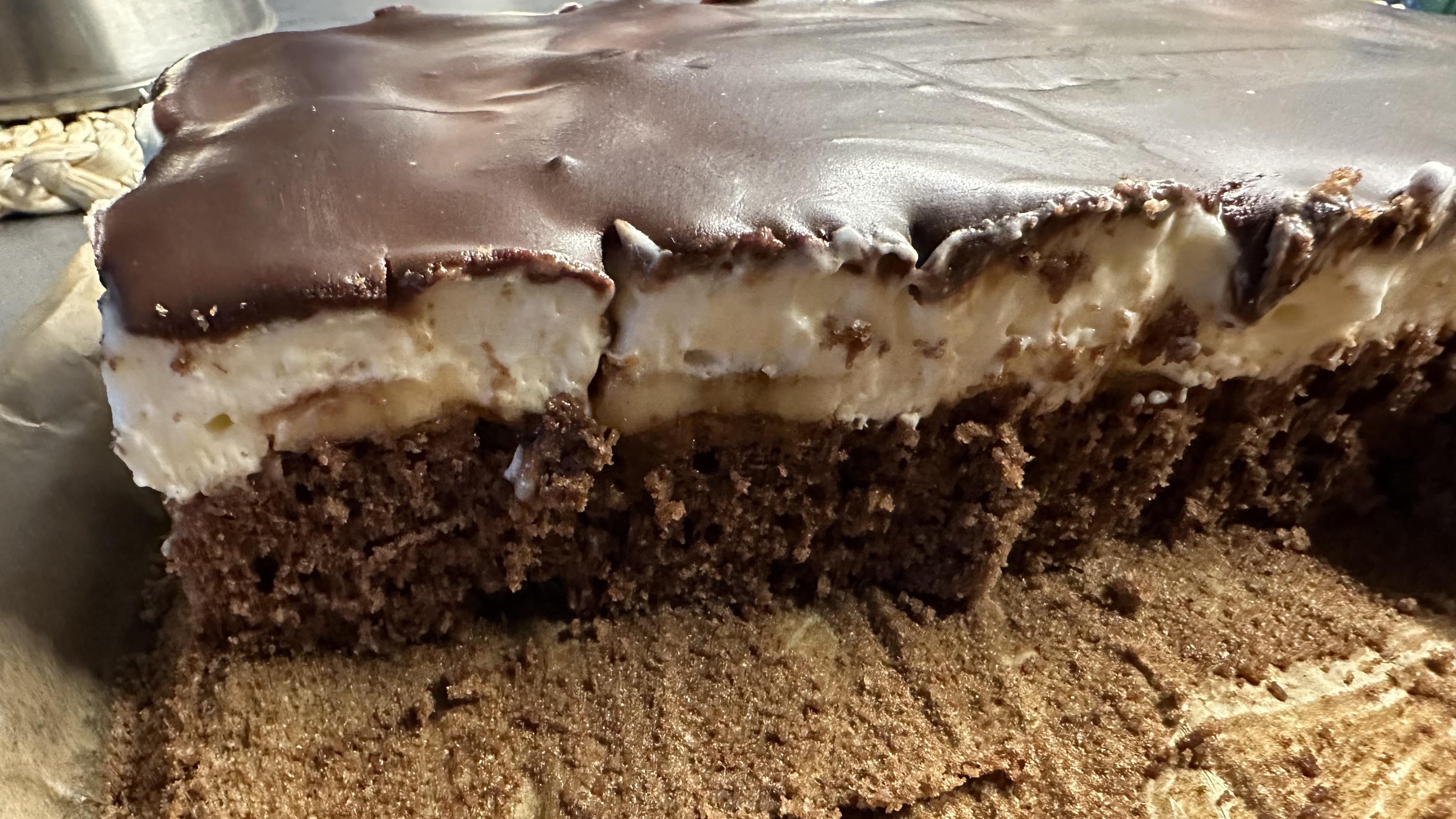 Kein Blechkuchen, sondern einzelne Dessertstücke. Sehr geile Kombination und der Geschmack war immer etwas unterschiedlich, je nach Reifegrad der Banane. Der Keksboden war eher fest, leicht knusprig, innen weich und stabil genug, um ein Stück in die Hand zu nehmen.