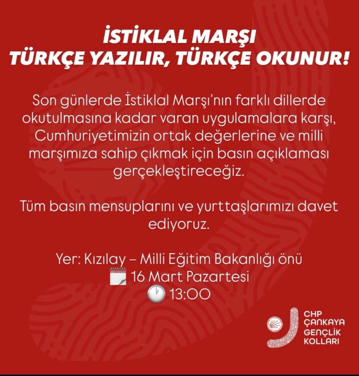 CHP ruft die Bevölkerung von Ankara heute um 13:00 Uhr zum Bildungsministerium auf, um die Nationalhymne auf Türkisch zu singen!