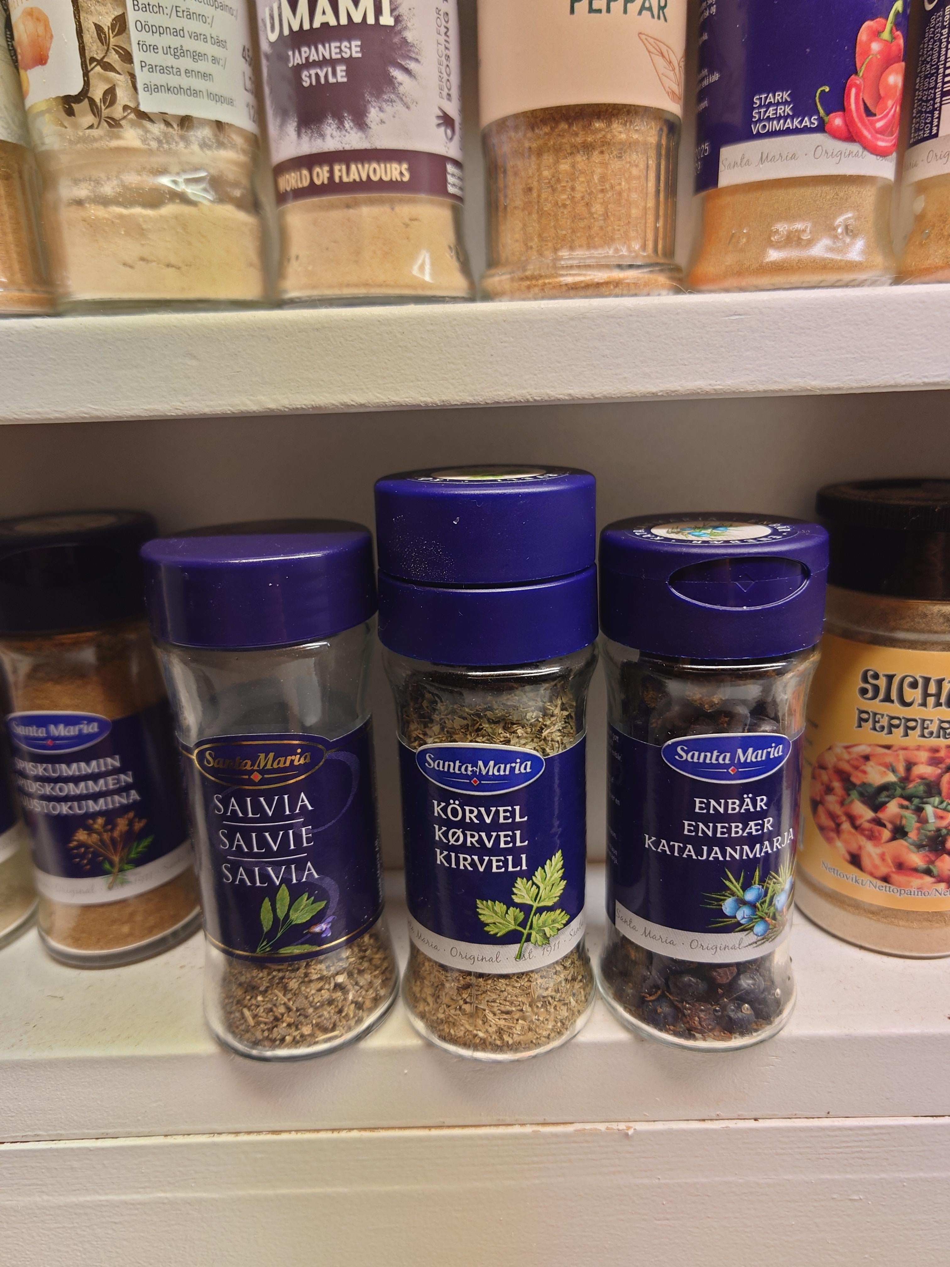 Jag ser att du samlat alla dina kryddor som man köper för ett specifikt recept som sen står och dammar i ett år tills man ska göra rätten igen. Fast man då köper en ny burk körvel för att få man glömt att man hade den första.