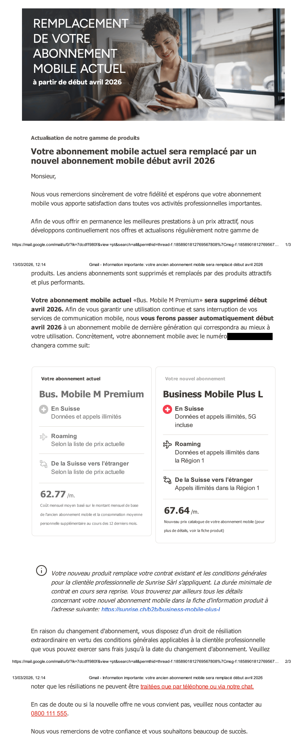 Sunrise zwang mich, auf ein neues Abo mit neuem Preis zu wechseln und teilte mir per E-Mail mit, dass ich eine außerordentliche Kündigungsmöglichkeit habe. Aber als ich danach frage, heißt es, das sei nicht möglich, weil mein Vertrag noch bis Februar 2027 läuft.