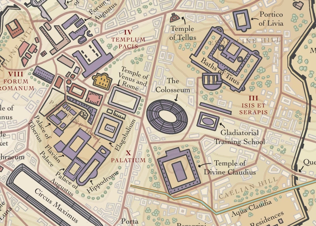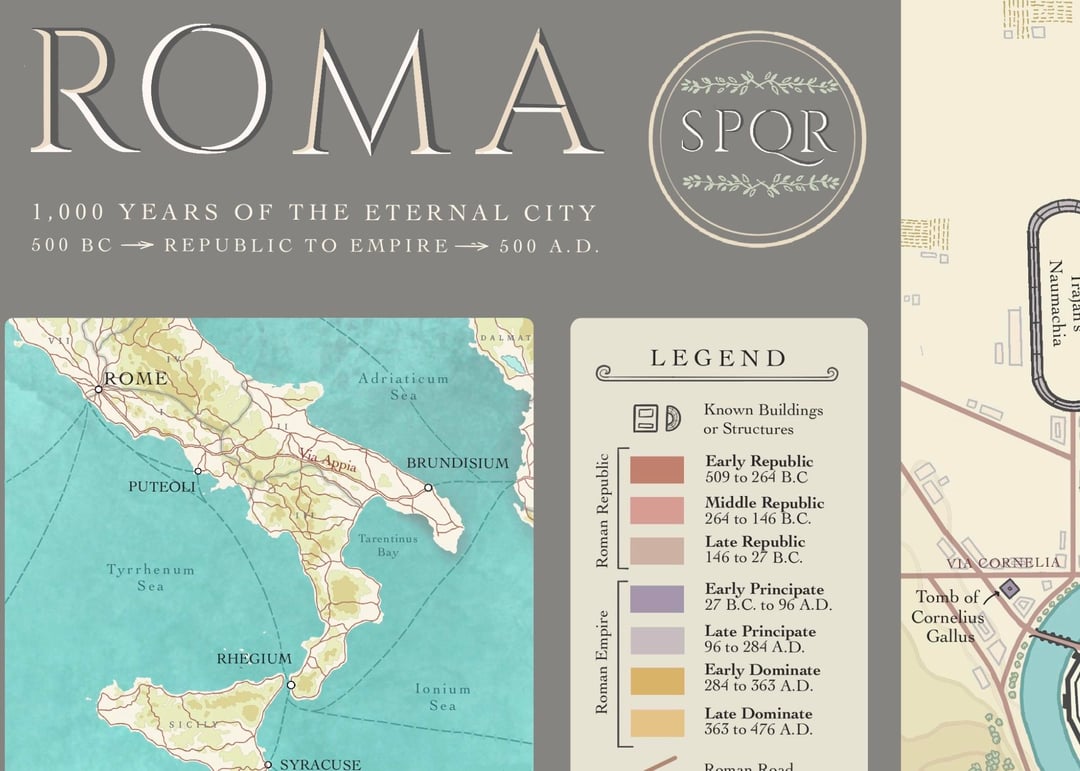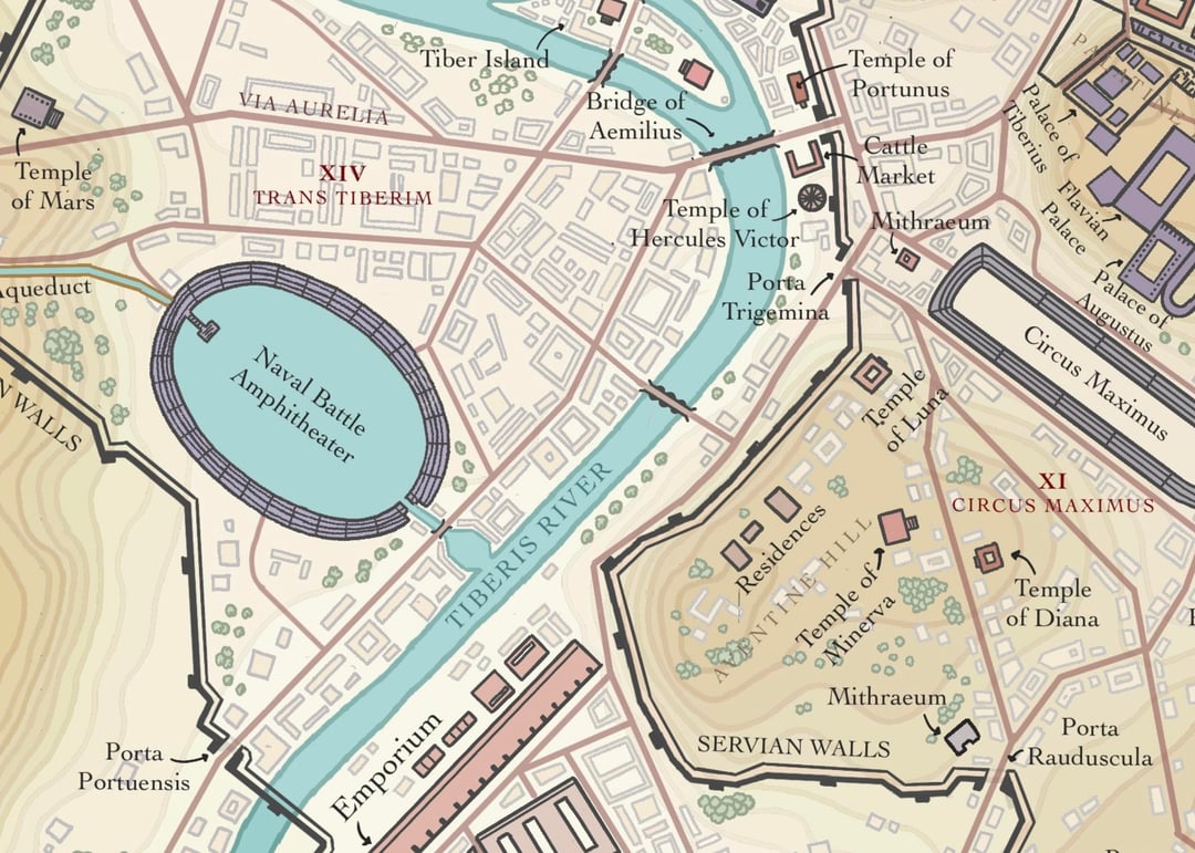 Wow, this map really took me a long time to make, with hours upon hours of research and detail to make, what I attempted, one of the most accurate and visually pleasing maps of Ancient Rome. The Eternal City is so massive that it’s easy to get lost in the history, so I color-coded everything to help it make sense. The known buildings are marked in shades of red for the Republic era, and purple or yellow for the Empire.