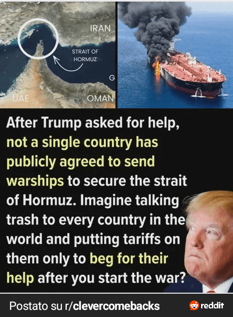 Also now begging for allies to help in the strait of Hormuz when a couple of days ago he said: