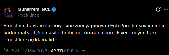 "Erdoğan, der das Urlaubsgeld für Rentner nicht erhöht hat, sollte allen Rentnern, die ihren Enkelkindern kein Taschengeld geben können, erklären, wie ein Staatsanwalt so viel Vermögen erworben hat."