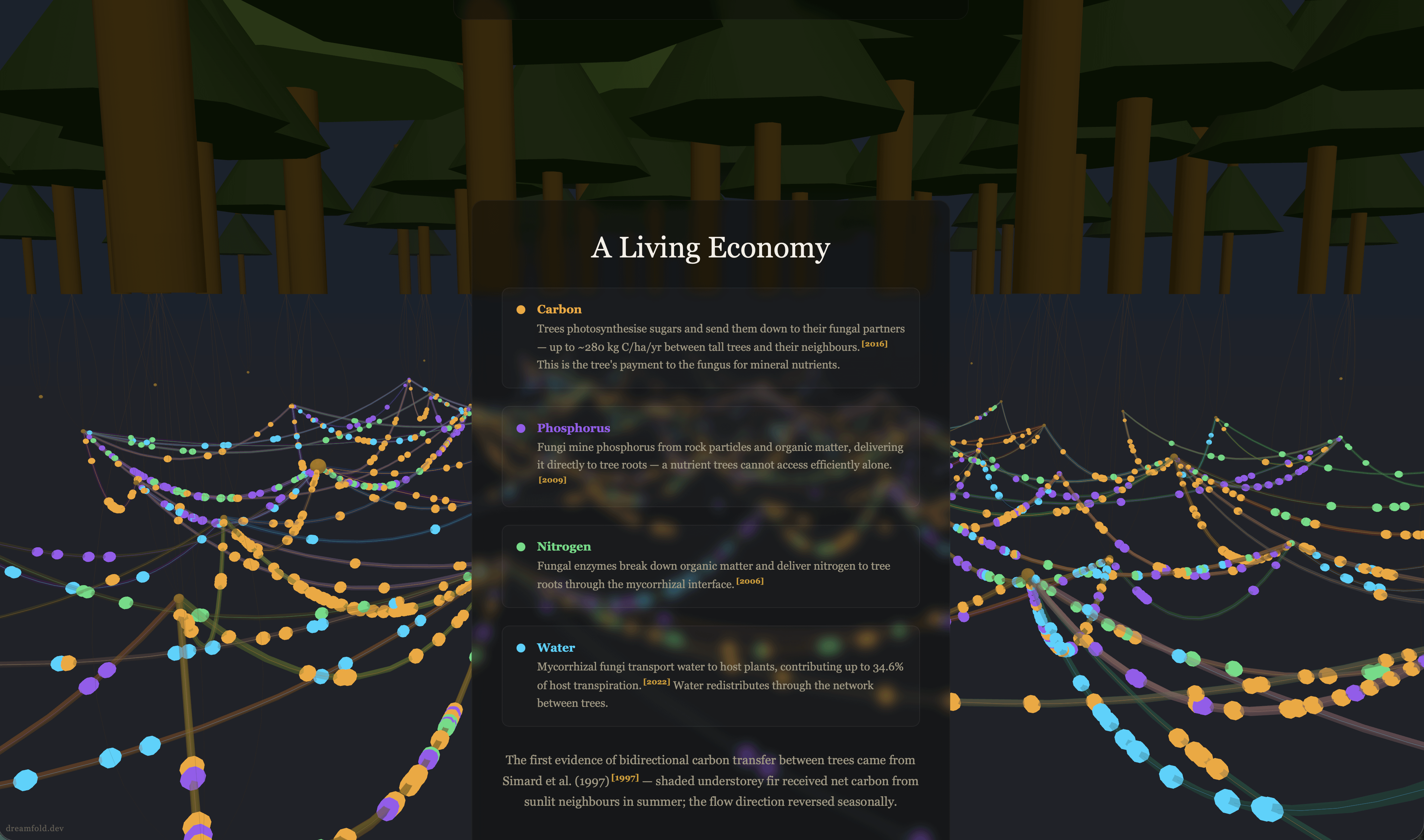 *Data* *source:* *Beiler* *et* *al.* *(2010)* *“Architecture* *of* *the* *wood-wide* *web“* *and* *Beiler* *et* *al.* *(2015),* *mapping* *multi-species* *fungal* *networks* *via* *genotyping* *of* *root* *tips.* *67* *Douglas* *fir* *trees,* *27* *Rhizopogon* *genets,* *220* *edges.* *Dataset* *enhanced* *with* *cohort* *classifications,* *depth* *ranges,* *nutrient* *directionality,* *and* *confidence* *levels* *derived* *from* *Simard* *et* *al.* *(1997,* *2012),* *Klein* *et* *al.* *(2016),* *and* *16* *other* *peer-reviewed* *papers* *cited* *in* *the* *app’s* *sources* *panel.*