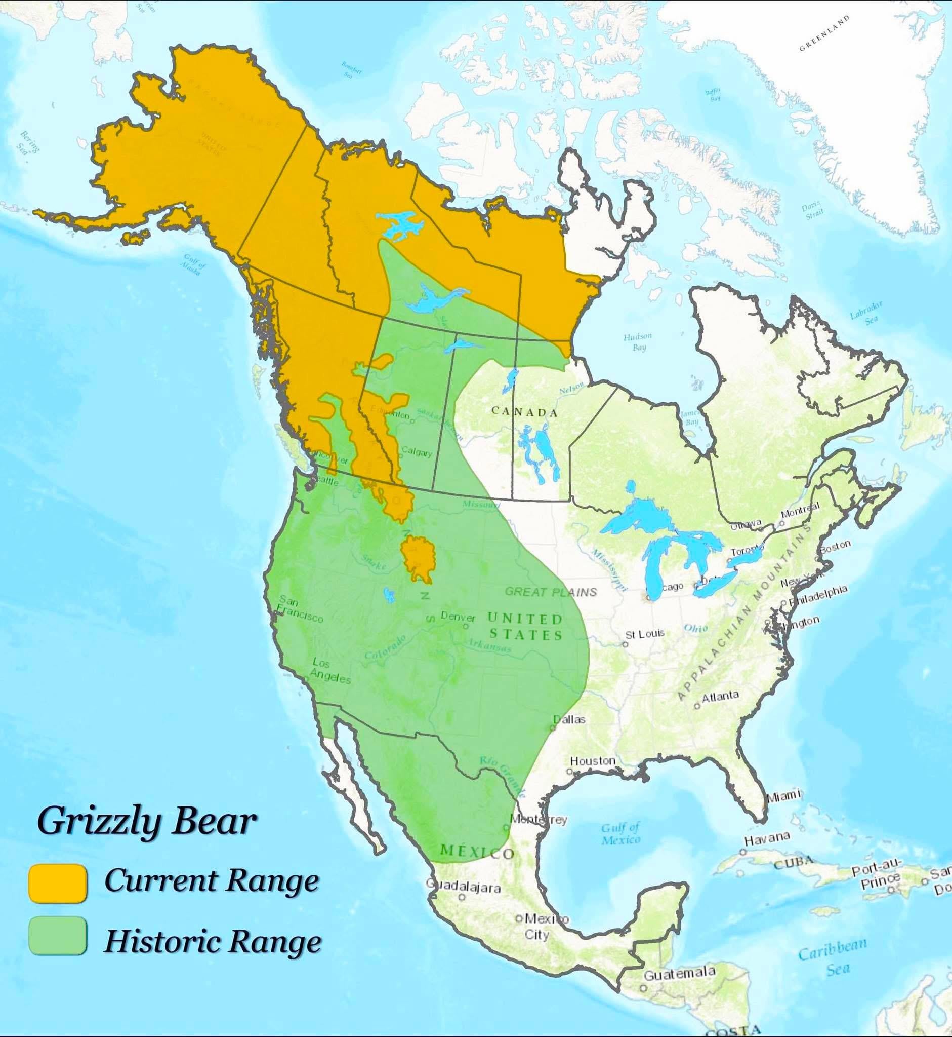 European colonization decimated North American grizzly bear populations. Within 125 years of European contact, the grizzly population dropped from an estimated 50,000+ to nearly 2% of their original range in the lower 48 states.