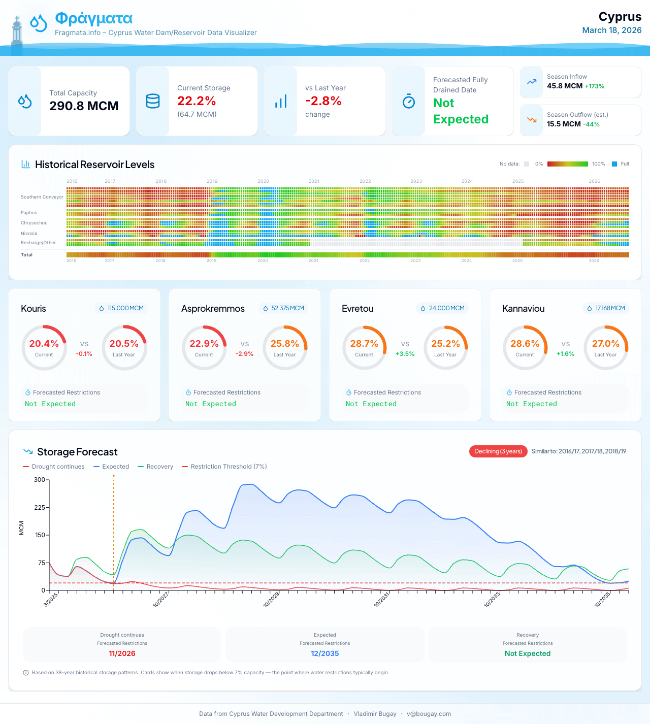 Das Verrückte: 12 von 21 Staudämmen haben jetzt mehr Wasser als zum gleichen Zeitpunkt des Vorjahres. Manche Zahlen sind einfach verrückt: Vyzakia hat 12x mehr als letztes Jahr, Xyliatos 3,5x, Argaka stieg von 37 % auf voll. Fünf Dämme bleiben bei 100 %.