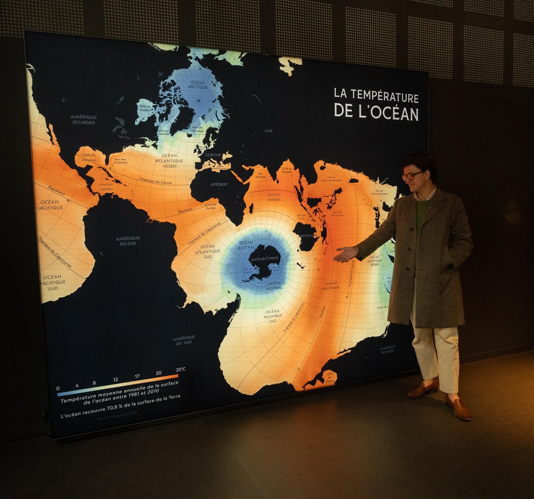 The museum is located in Brest, France and its name is ‚70.8‘ and is dedicated to the ocean (if you haven’t been there yet, go check it out—it’s really great) so obviously the map HAD to feature the Spilhaus projection, a 1942 map projection made to showcase the World’s oceans in one single continuous entity, helping visualise its physical and chemical dynamics.