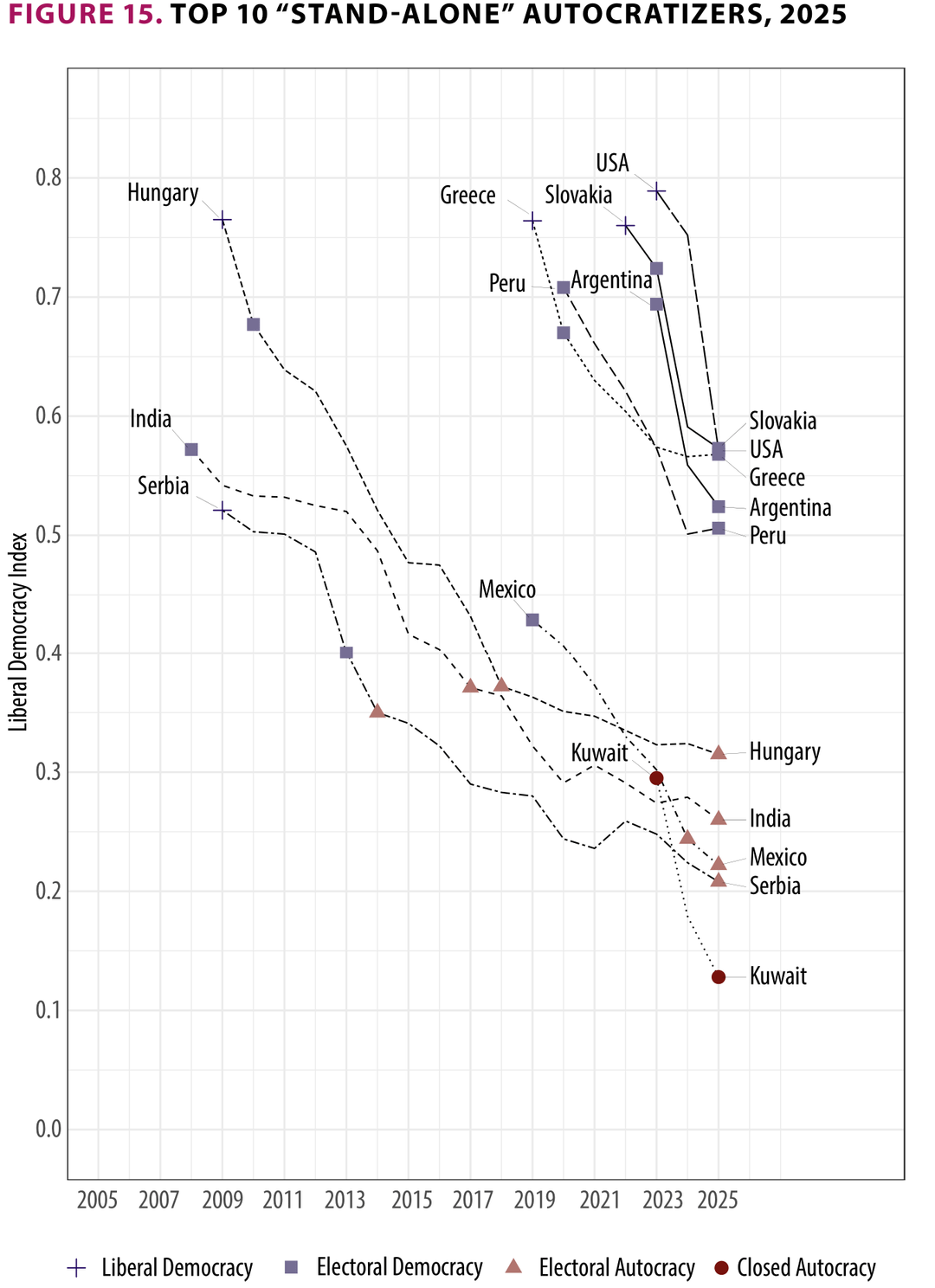 >Autocratization in Greece started in 2020, and almost immediately led to the loss of its liberal democracy status. Prime Minister Kyriakos Mitsotakis gradually weakened the rule of law and attacked media freedom. The worsening seems to have paused in the past two years.