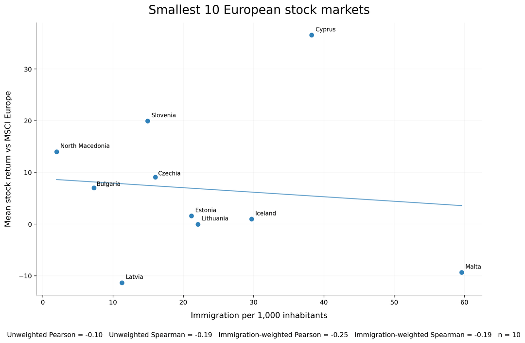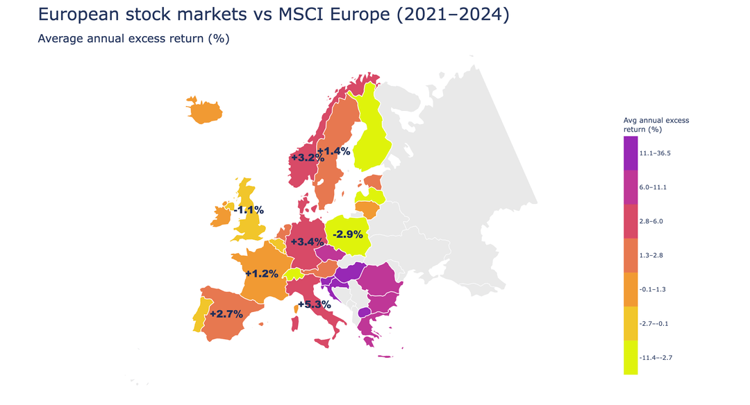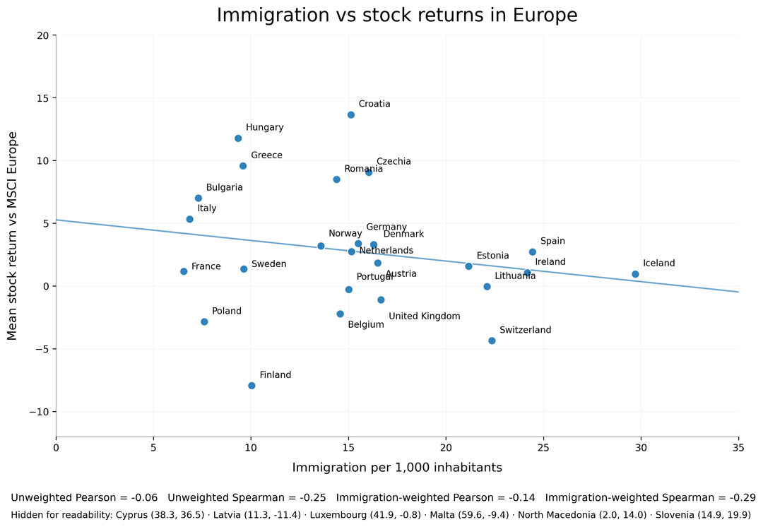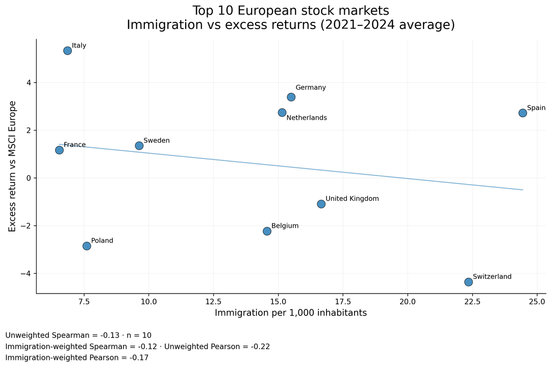 [OC] Outperformance der Einwanderungs- und Aktienmärkte in Europa nach Ländern (2021–2024)