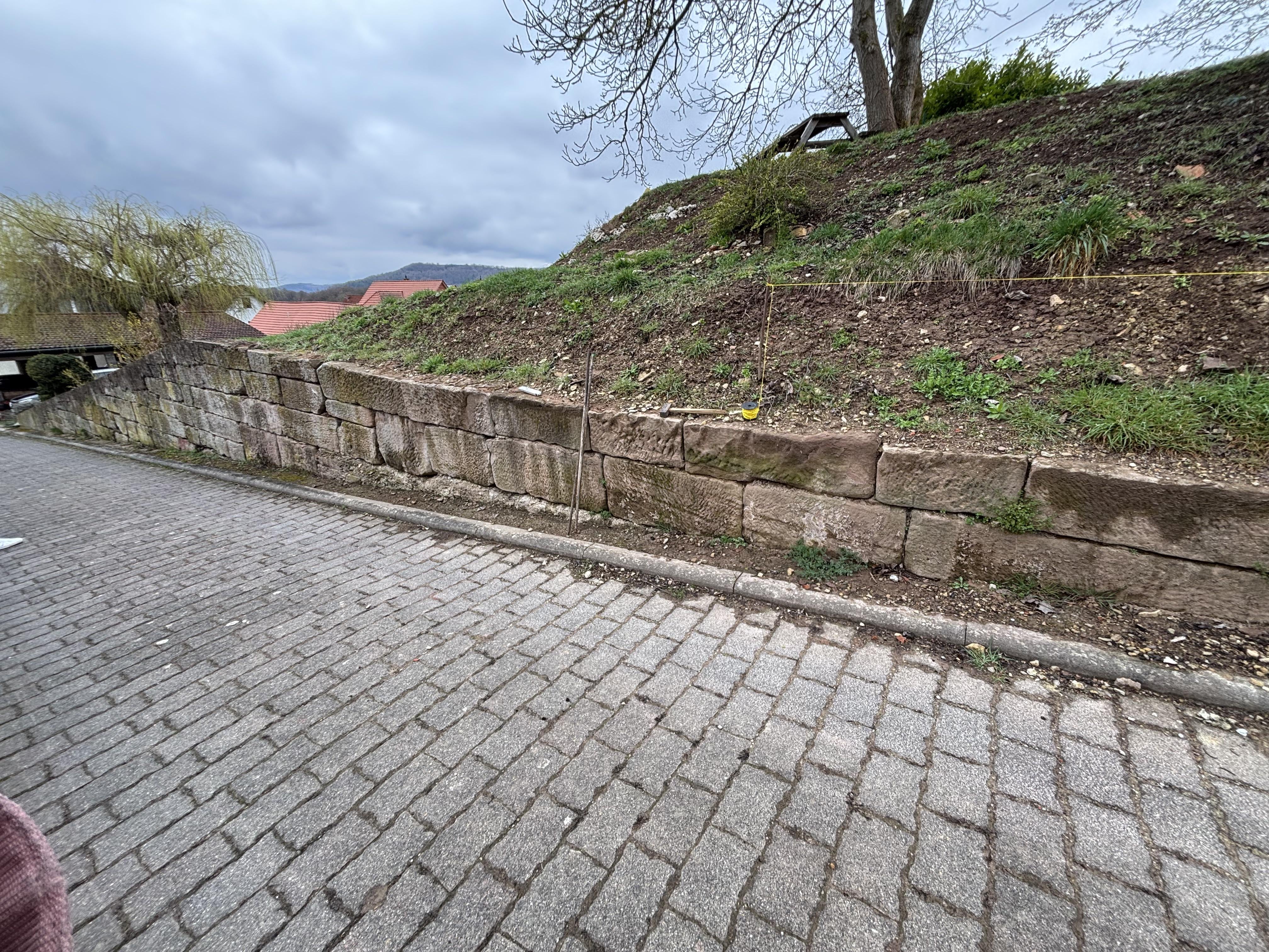 wie vielleicht auch andere hier, haben wir einen Hanggarten. Zu einer Seite wird dieser aktuell durch eine Sandsteinmauer abgefangen – daneben ist eine Straße. Da die Mauer schon lange steht und leider nach und nach immer weiter kippt, haben wir die obersten Reihen schon entfernt. Nun wollen wir sie komplett erneuern.