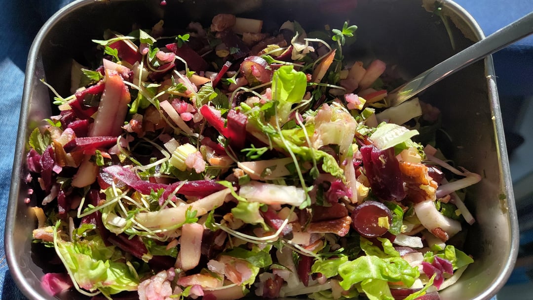 Heute haben mich diese jungen Gierschblätter angelacht. Ein guter Teil davon ist zusammen mit Wildreis, roter Beet, Apfel, Weintrauben, Stangensellerie, Kopfsalat, Wallnüssen, Kresse, Fenchel und fermentierter Rotkohl in den Salat gewandert. Man könnte aber auch gut Spinat, Suppen, Füllungen von Sommerrollen, Wurzpulver oder Cracker daraus machen. Der Geschmack liegt irgendwo zwischen ner kräftigen Möhre und Petersilie.