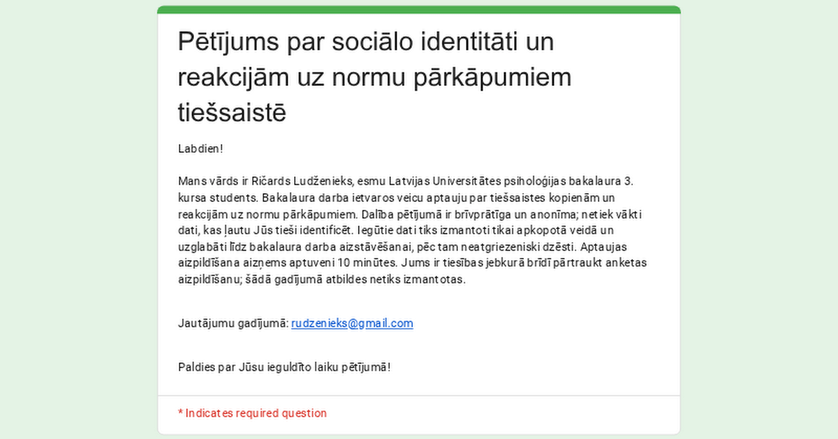 Ich bin ein Bachelor-Student der Psychologie an der Universität Lettland und habe eine anonyme Umfrage über Online-Communities und Reaktionen auf Normverstöße in Lettland durchgeführt.