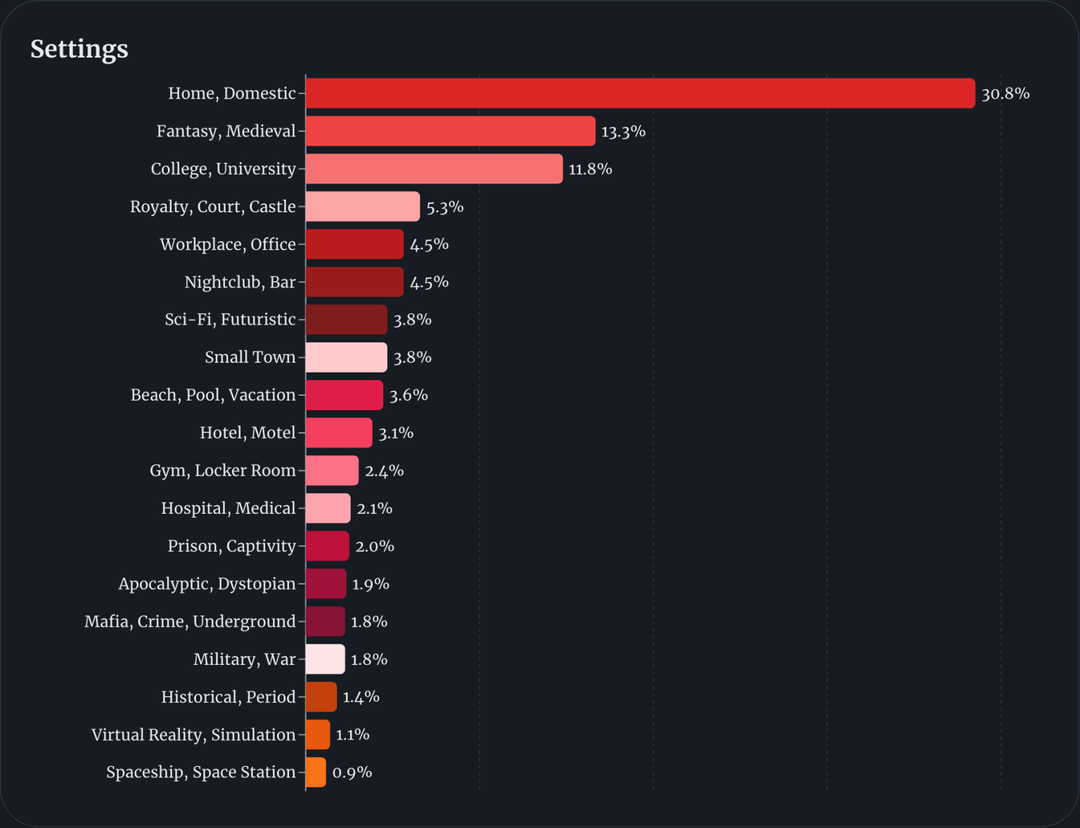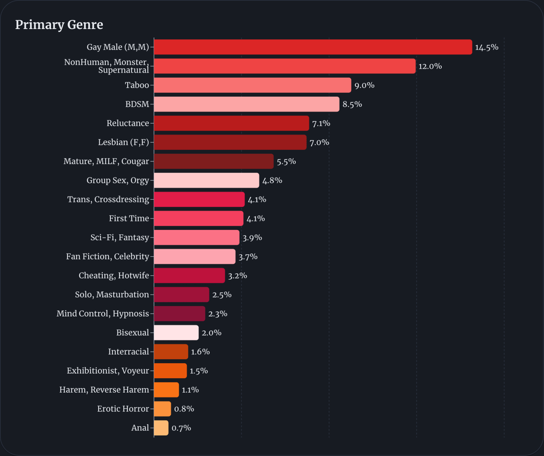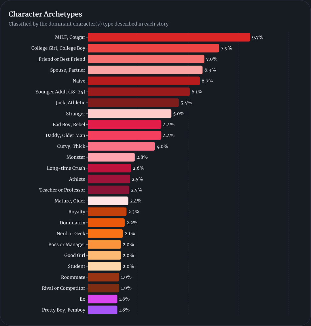 I’m surprised femboys are the last character archetype while mlm is the top genre. Very interesting data.