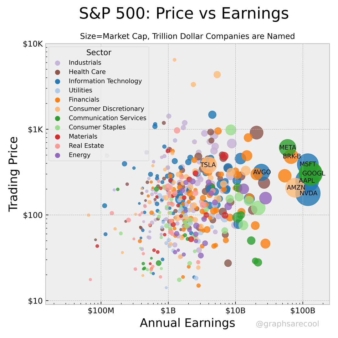 Auf der zweiten Folie sind alle S&P 500-Unternehmen nach logarithmischem Handelspreis und logarithmischen Jahresgewinnen dargestellt. Die Punkte sind nach GICS-Sektor und Größe nach der gesamten aktuellen Marktkapitalisierung gefärbt.
