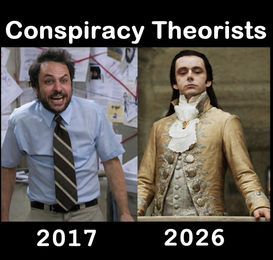 Conspiracy theorists have a long way to go before you can praise them with fancy outfits. In fact, even the guy on the left seems too fancy for them.
