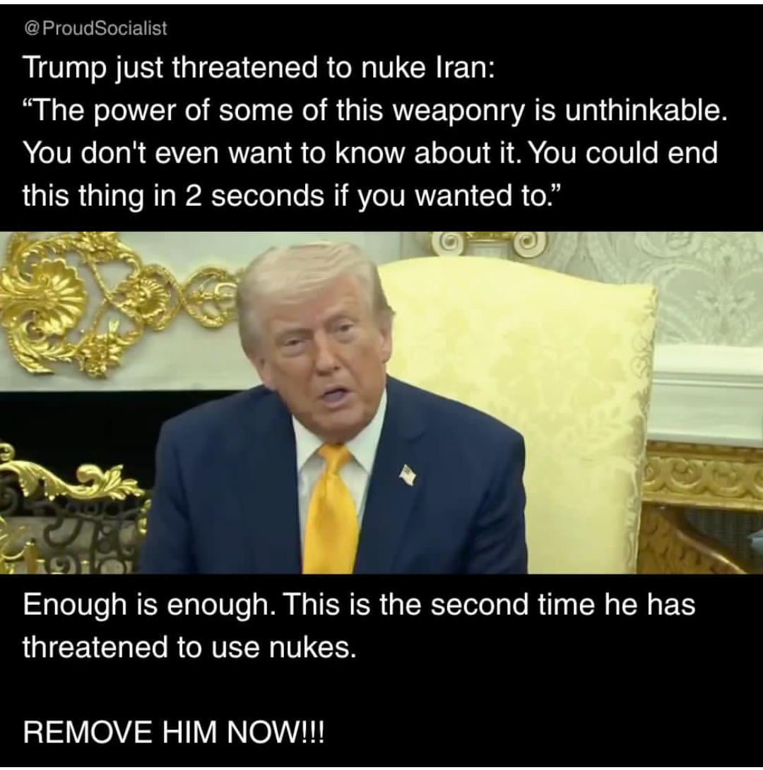 Nukes? Bruh they probably have a railguns that’ll just drop tungsten on Iran or other shit we can’t even fathom.