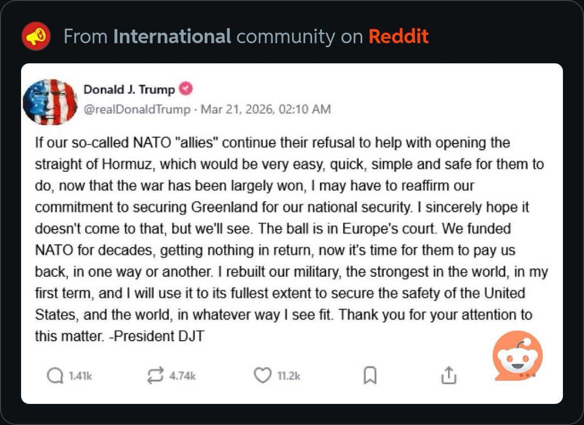 Trumpik ztrácí podporu v USA, protože jim vystřelila cena nafty nahoru a na to jsou v USA hodně citliví. Takže vidí, že ztrácí i důvěru svých voličů, protože jim konečně dochází, že jim Trump nasliboval pohádky. A protože je Trumpik v koutě, nenapadne ho nic lepšího, než postnout víceméně výhrůžku, že pokud mu Evropa nepomůže, obsadí Grónsko.
