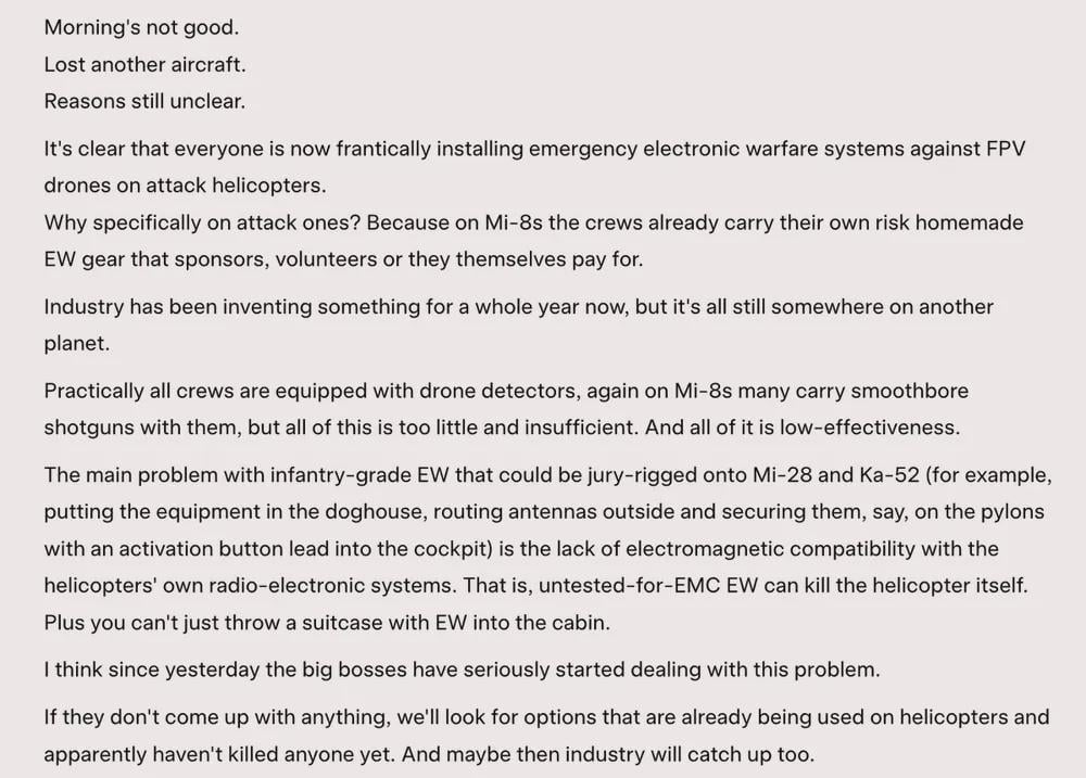 It could be something mostly on the Ukrainian side that brings a combination of improvement in detection and the range of interdicrion by drones which has further improved and is now more threatening to helicopters loitering at ranges behind the lines that they were typically safe before.