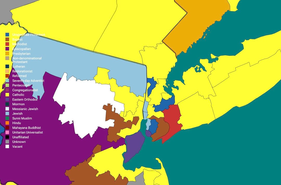 I really dislike maps like these that use similar colors across categories. It’s hard to tell if my representative is Episcopalian, Congregationalist, or Eastern Orthodox. One suggestion is to stick to R,O,Y,G,B,I,V then use hatches or dots if there are more categories than seven.