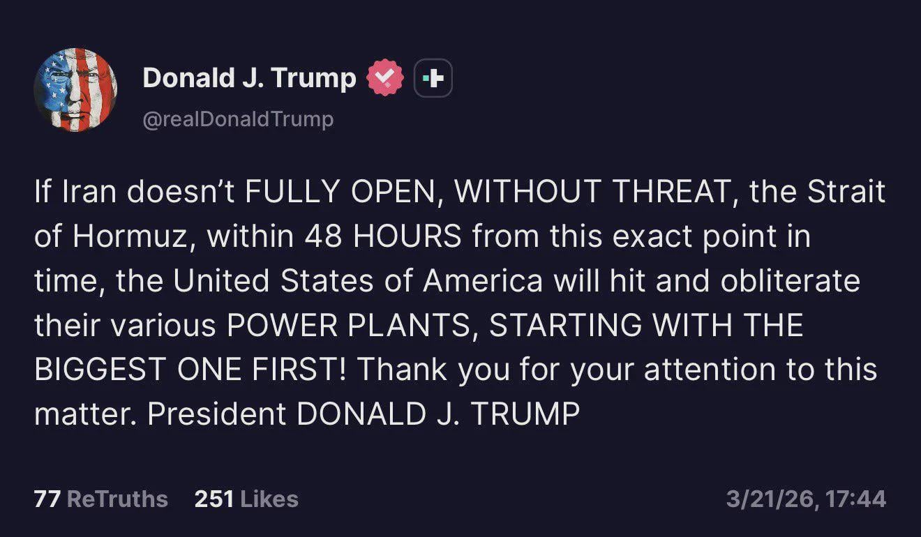 So Iran bombs Israel and Gulf State electric grids, translated we are going to bomb the gulf back into the stone age so China, India, Turkey can get fuel from region, cripple peer competitors rely upon US domestic oil supply. Won’t work. US big oil ain’t going to be selling US oil domestically for 20% less than they get selling overseas.