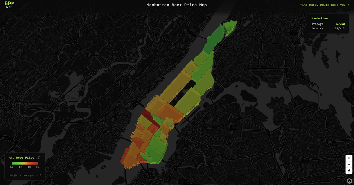 **Data source:**Â Original dataset of 2,537 NYC bars with pricing, collected from bar websites, online menus, and user reports. Data was consolidated for a happy hour finder site I made for NYC (5pm.nyc).