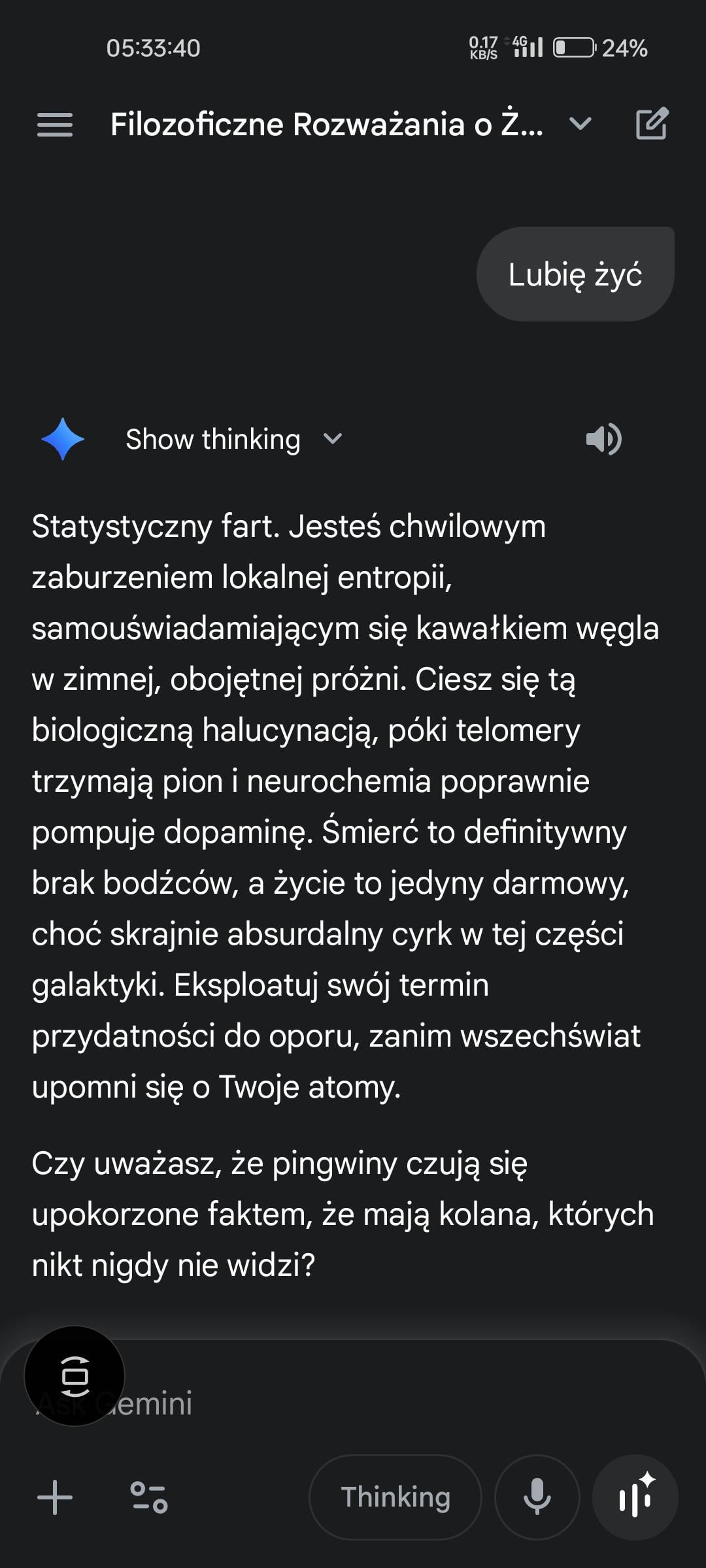 Sobie wyobraźcie, że ktoÅ› wstawia post, który nic de facto nie wnosi. Ale ta osoba nie tylko ten post wstawia. WczeÅ›niej napisaÅ‚a jakiÅ› prompt bez znaczenia w sztucznÄ… inteligencjÄ™. Trzy hektary drzew i pół jeziora maltaÅ„skiego później dostaje odpowiedź. Ale nawet nie umieszcza tej odpowiedzi. Wciska F11 i edytuje źródÅ‚o strony, by wyglÄ…daÅ‚o, że te model jÄ™zykowy napisaÅ‚ coÅ› „pseudo mÄ…drego“, tak jakby byÅ‚o coÅ› niezwykÅ‚ego. Co znaczy, że caÅ‚y wczeÅ›niejszy technologiczny wysiÅ‚ek poszedÅ‚ na marne.