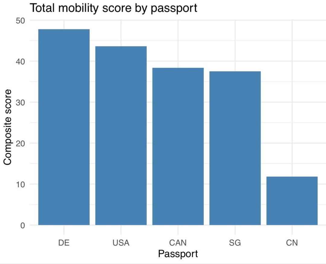Interessanterweise führt diese Methode zur Berechnung des Passindex zu einer Rangfolge, die sich stark von den meisten herkömmlichen Passindizes unterscheidet. Der Singapurer erweist sich als deutlich leistungsschwächer. Überraschenderweise schnitt das US-Reiseziel viel besser ab und übertraf sogar die kanadischen und singapurischen Länder, die in Indizes, die nur die kategorische Anzahl visumfreier Reiseziele berücksichtigen, fast immer weiter oben stehen.