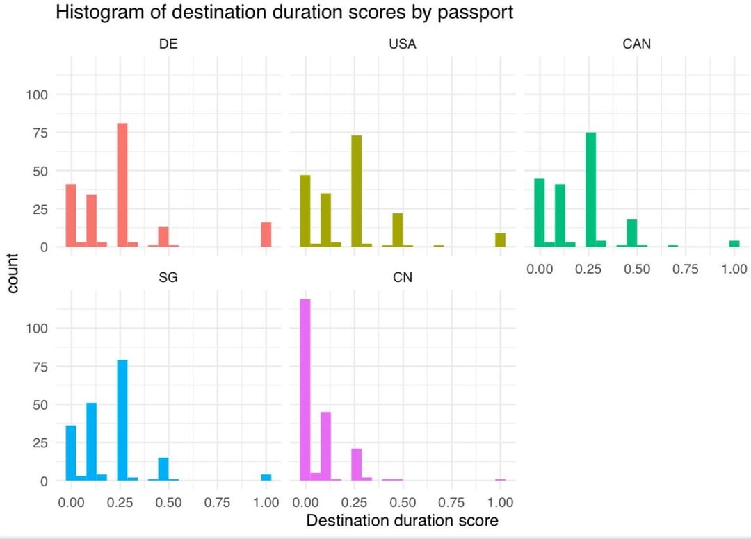 - Wenn ein Visum erforderlich ist und keine E-Visum-Option verfügbar ist, wird für ein bestimmtes Reiseziel eine Punktzahl von -1 vergeben. Hier geht es darum, die zusätzliche Belastung durch Papierkram und Unsicherheit, daher die Strafe, zu berücksichtigen.
