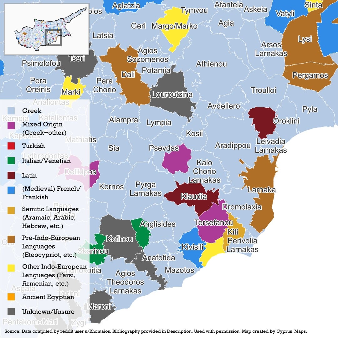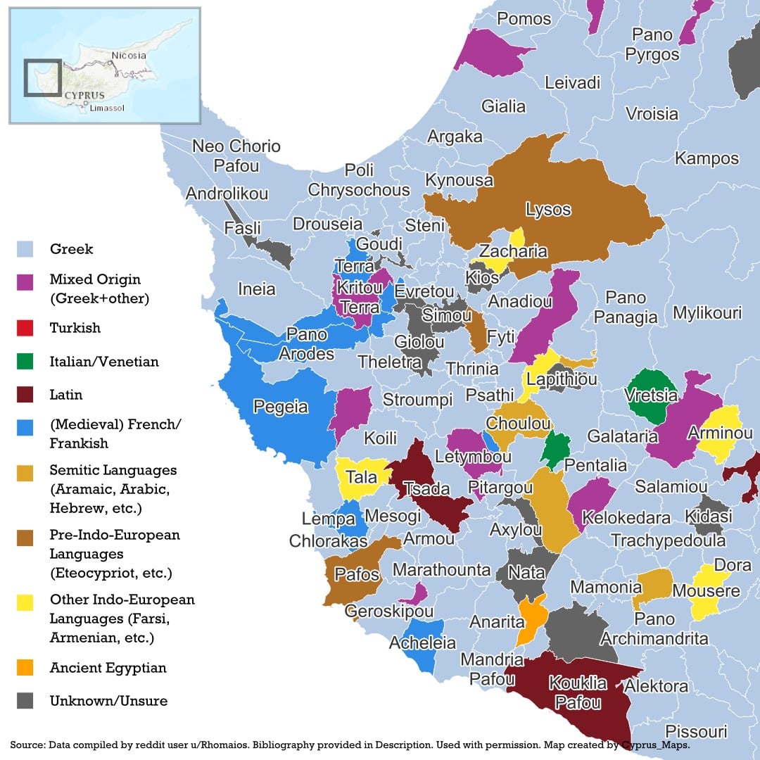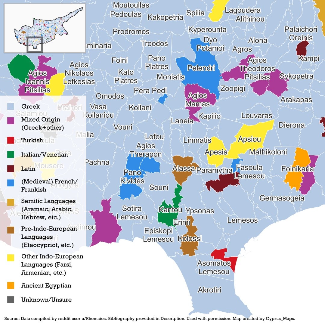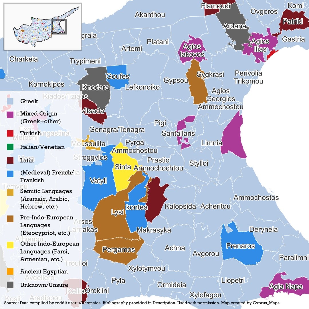Die etymologischen Ursprünge zypriotischer Ortsnamen, basierend auf einem umfassenden Datensatz, zusammengestellt von u/rhomios. Ihre Quellen sind unten aufgeführt.