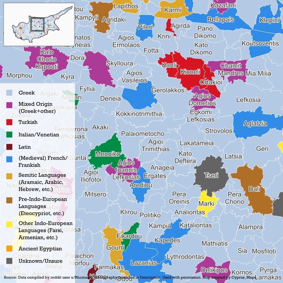 Ein bedeutendes Beispiel, das aufgrund seiner Zugehörigkeit zur Gemeinde Famagusta nicht auf der Karte erscheint, ist Varosha, das ursprünglich ungarischen Ursprungs (Varos = Stadt) ist, aber über das Türkische (varoş = Vorort/Stadtrand) nach Zypern gelangte. Das und einige weitere überraschende Ursprünge werden in diesem Beitrag erläutert u/Rhomios: https://www.instagram.com/p/DU3kIXXDVaw