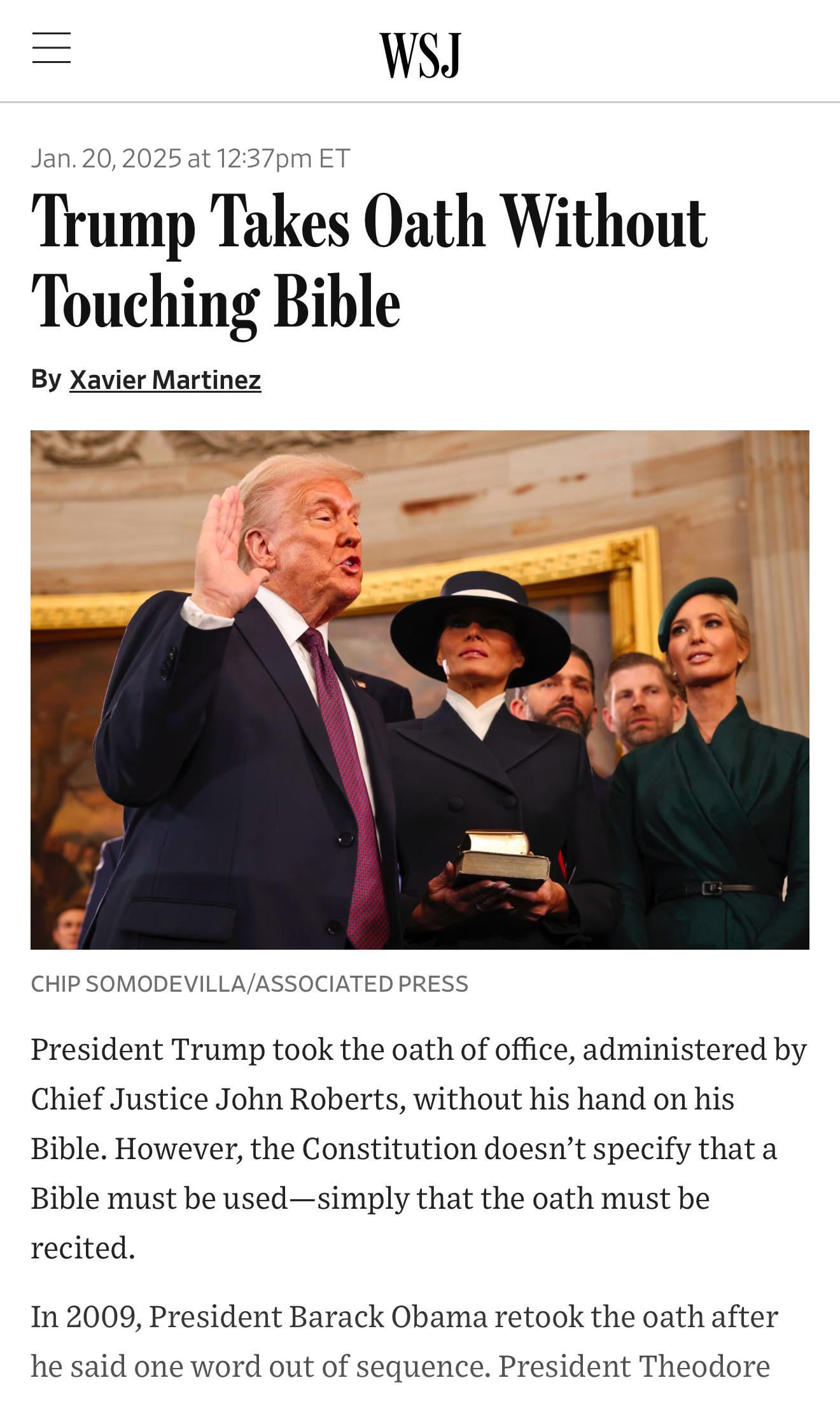 He isn’t the first John Quincy Adams took his oath on a law book. Teddy Roosevelt didn’t either, and LBJ accidentally took it on a different book in the aftermath of the JFK assassination