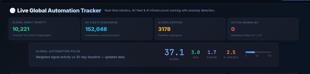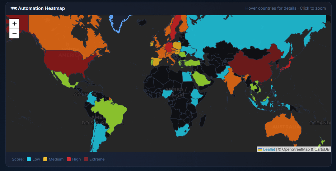 Dies ist von Roboradar24, ein von mir erstellter Live-Automatisierungs-Tracker. Die Farbintensität spiegelt den zusammengesetzten Automatisierungswert jedes Landes wider – gewichtet nach Roboterdichte (40 %), KI-Rechenzentren (50 %) und AV-Flottengröße.