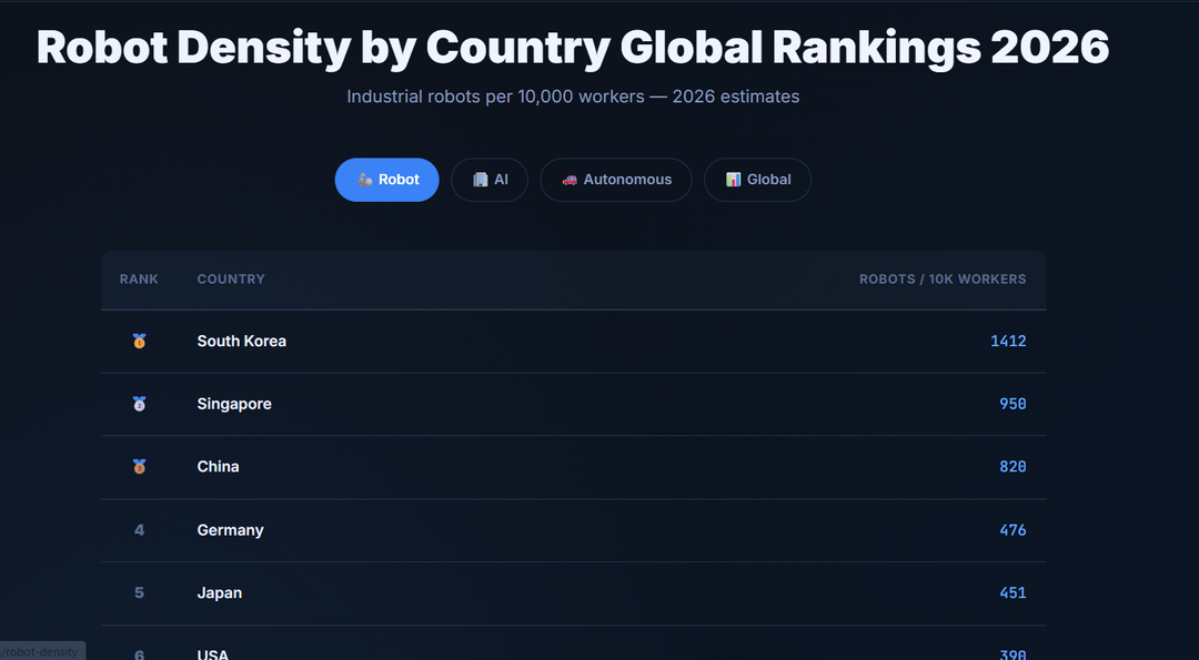 - Südkorea führt mit 1.412 Robotern/10.000 Arbeitern, gefolgt von Singapur (950) und China (820).