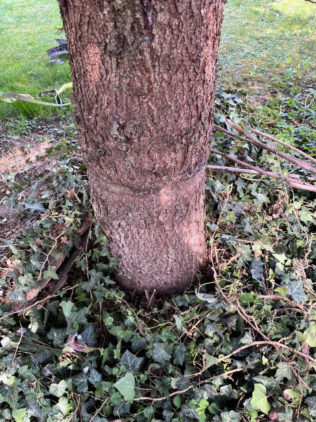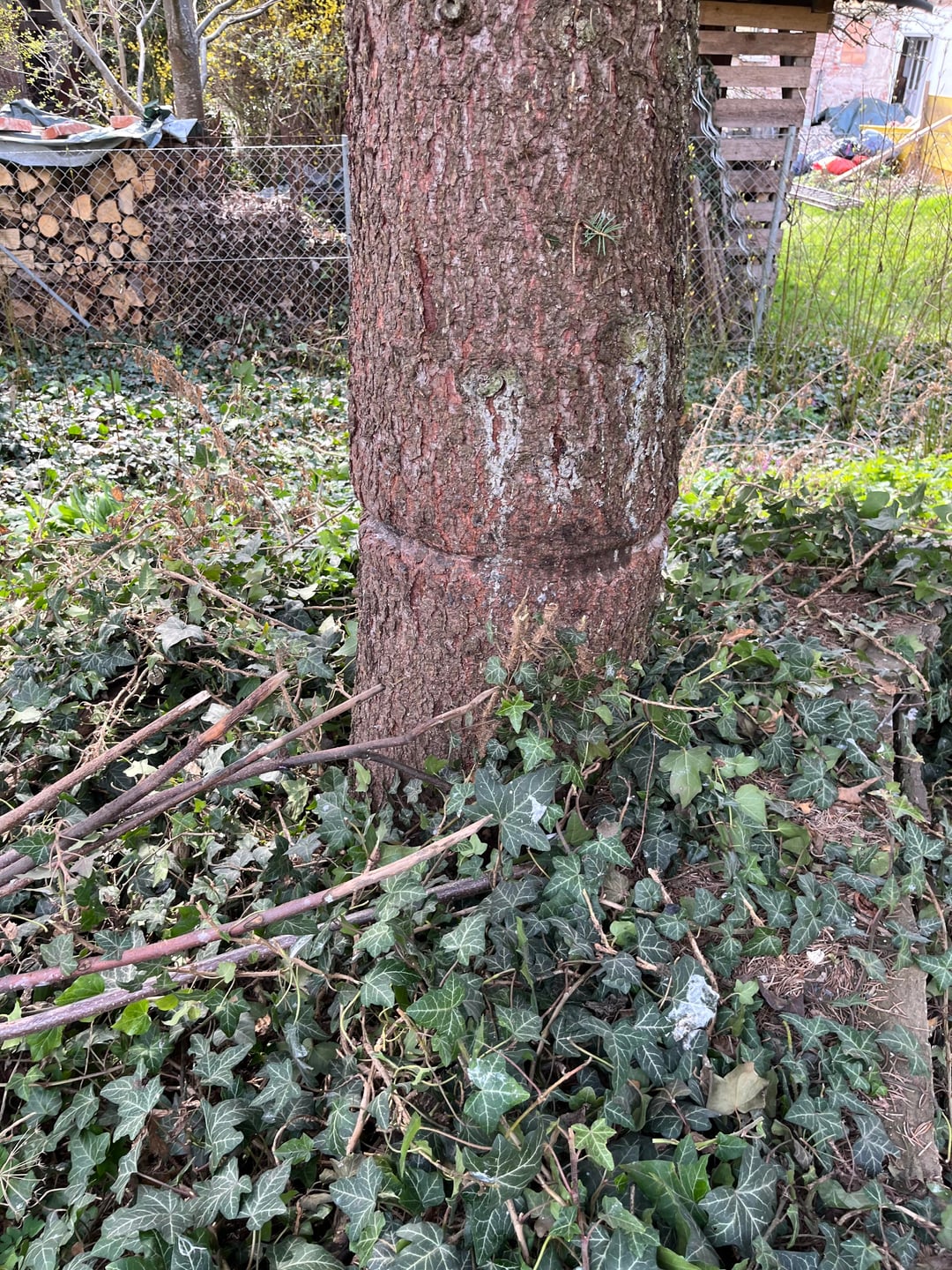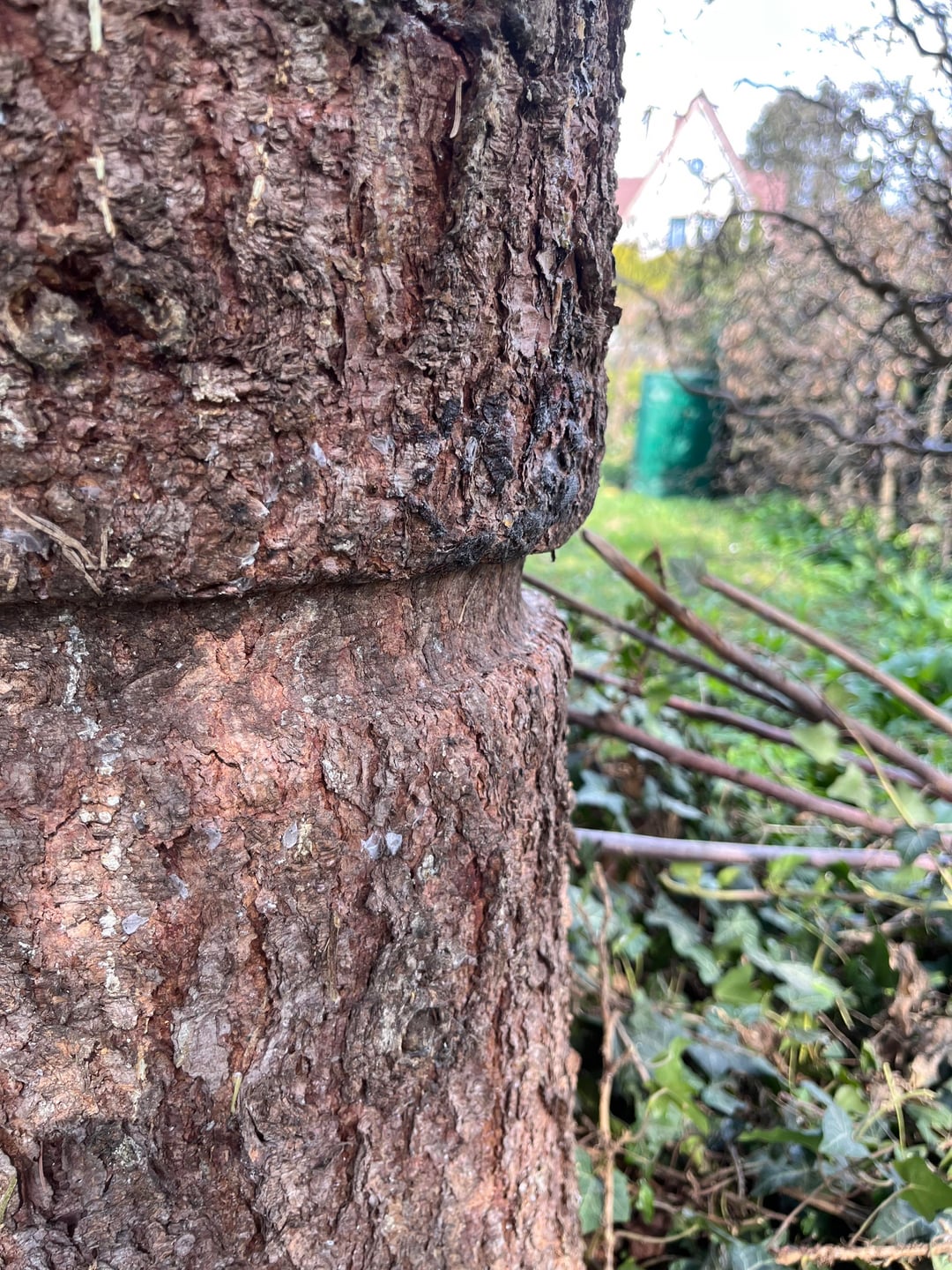 Hier sieht man ganz gut, wie Bäume mit Einschnürungen umgehen können. Sie wachsen einfach drum herum (bis ihnen doch irgendwann die Säge ein Ende macht). Mach dir darüber keine Gedanken bei deinem Baum.