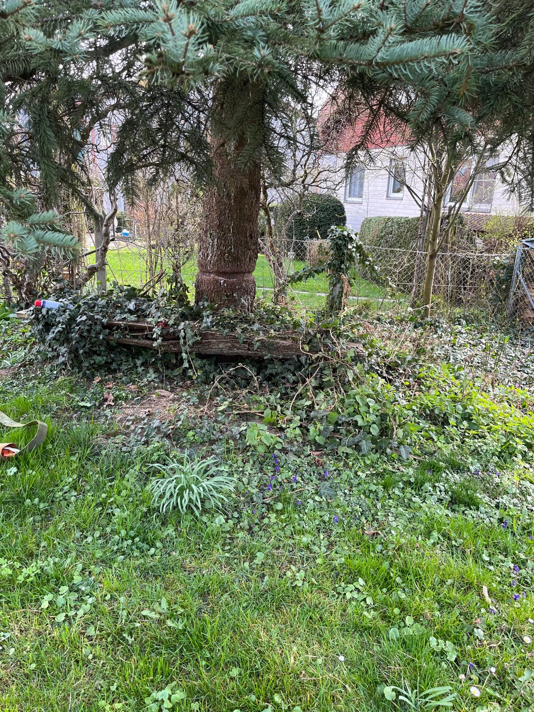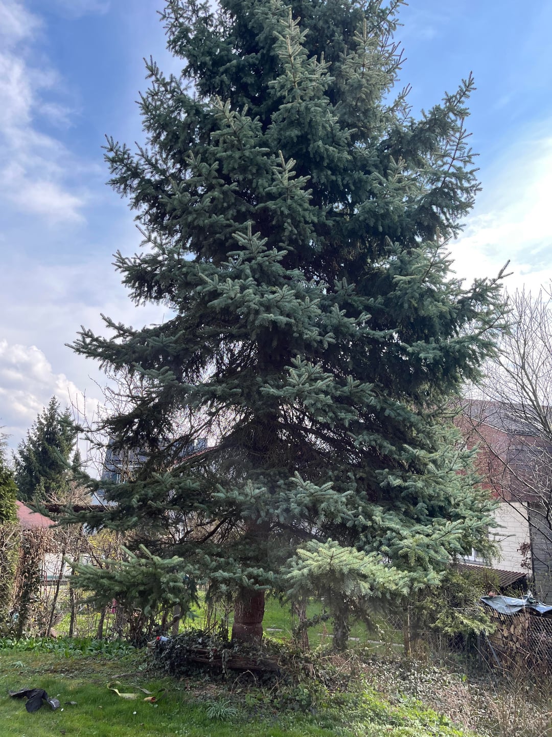 Edith: und hör bitte nicht auf diejenigen die ihn Fällen würden! Diejenigen sind offenbar nie in den Genuss gekommen einen Garten mit alten Bäumen zu erleben. Alte Bäume sind wertvoll! Deine Fichte bietet sehr vielen Tieren Unterschlupf und Futter. Auch Bienen und andere Insekten profitieren davon (z.B. Wald-Honig).