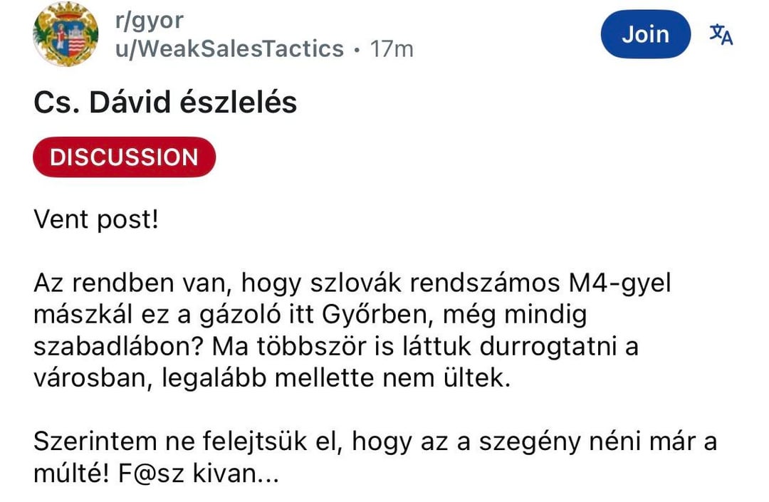 „Eine 76-jährige Frau, die an einer Bushaltestelle in der Szent István út wartete, kam bei dem Unfall ums Leben, als sie von einem Sportwagen überfahren wurde, der auf den Bürgersteig prallte. Der Fahrer des Autos gab seine Verantwortung für den Unfall zu, das Bezirksgericht Győr ordnete am Dienstag eine einstweilige Verfügung gegen ihn an und ordnete ihm an, einen Tracker zu tragen. Dávid Cs. und seine mit ihm reisende Freundin erlitten bei dem Unfall leichte Verletzungen.“ –