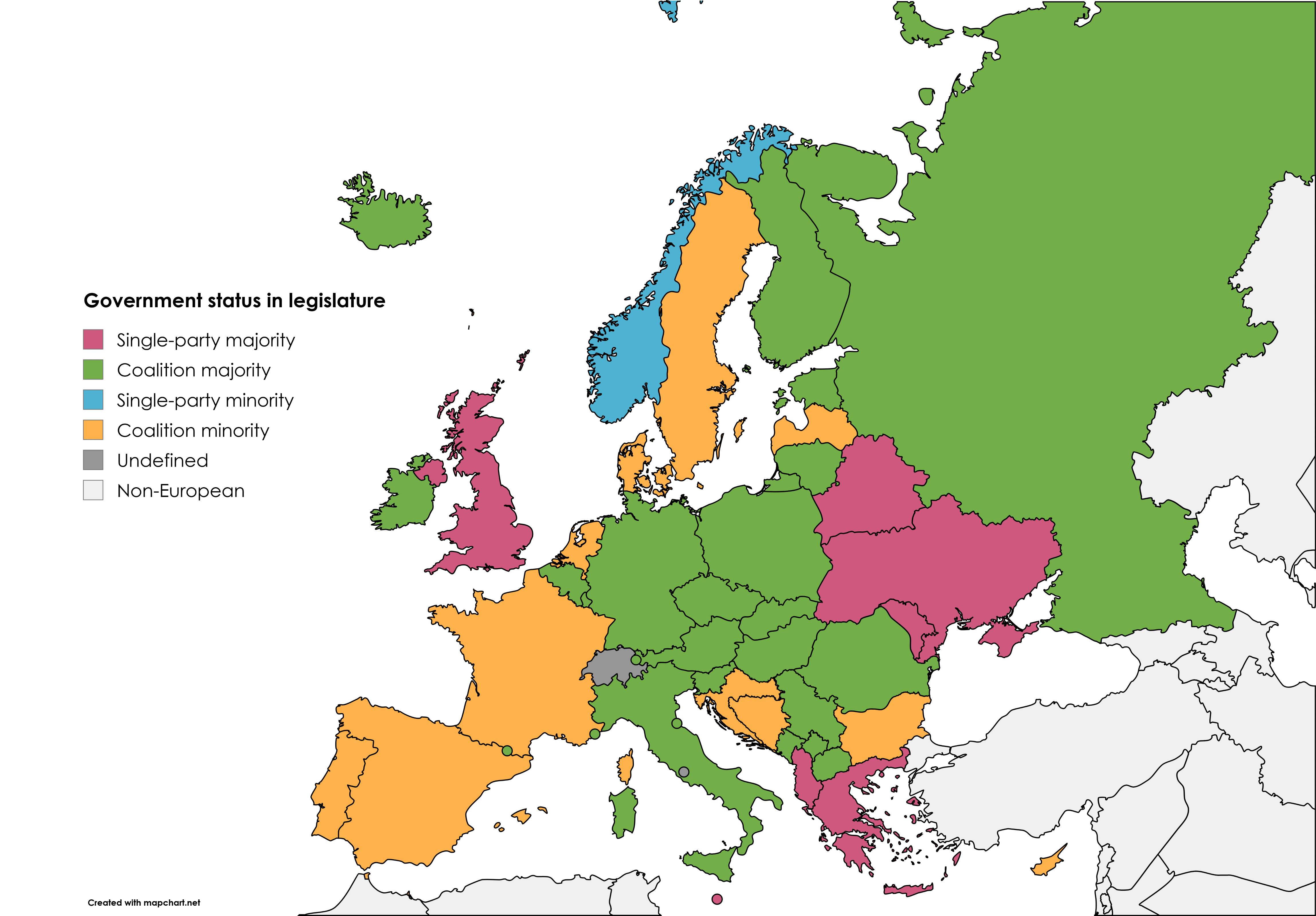 Bearbeiten: Ich habe vergessen zu erwähnen, dass ich es immer noch als solche gezählt habe, als die Regierung aus einer Partei und einer beliebigen Anzahl von Unabhängigen bestand "einparteiig" da es sich nicht um eine Parteienkoalition handelt. Dies ist in Moldawien und Weißrussland der Fall, wo die Regierung ohne diese unabhängigen Mitglieder nicht über die Mehrheit verfügen würde.