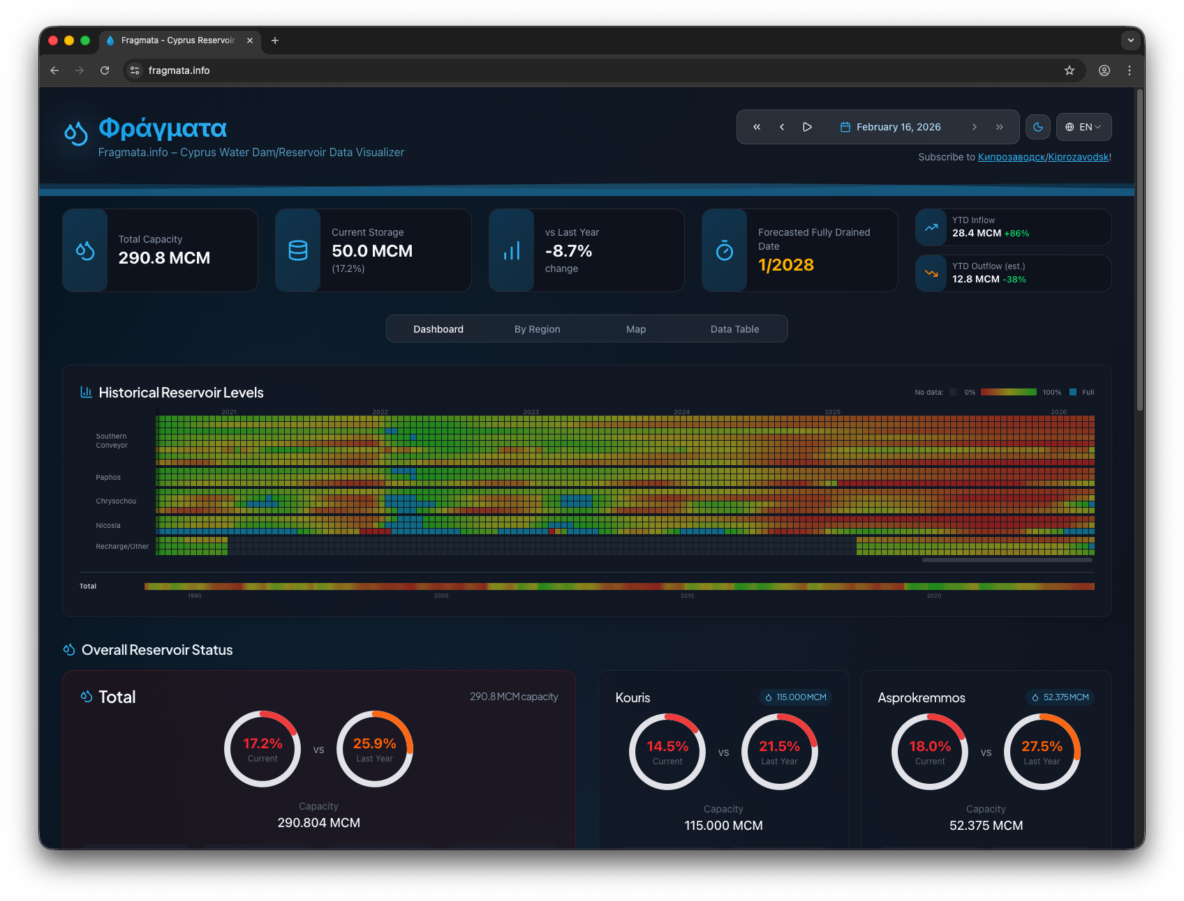 • Asprokremmos (zweitgrößter Staudamm) stieg innerhalb von drei Tagen von 23 % auf 29 % und fasst jetzt mehr Wasser als jemals zuvor im letzten Jahr