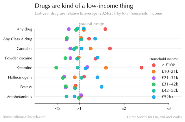 Your last slide claims that drugs are a low income „thing“ but your own results show that it more accurate to say there is a dip between those earning ~£30-50K, with those earning more are just as likely if not more likely to use certain drugs then those earning under £20k.