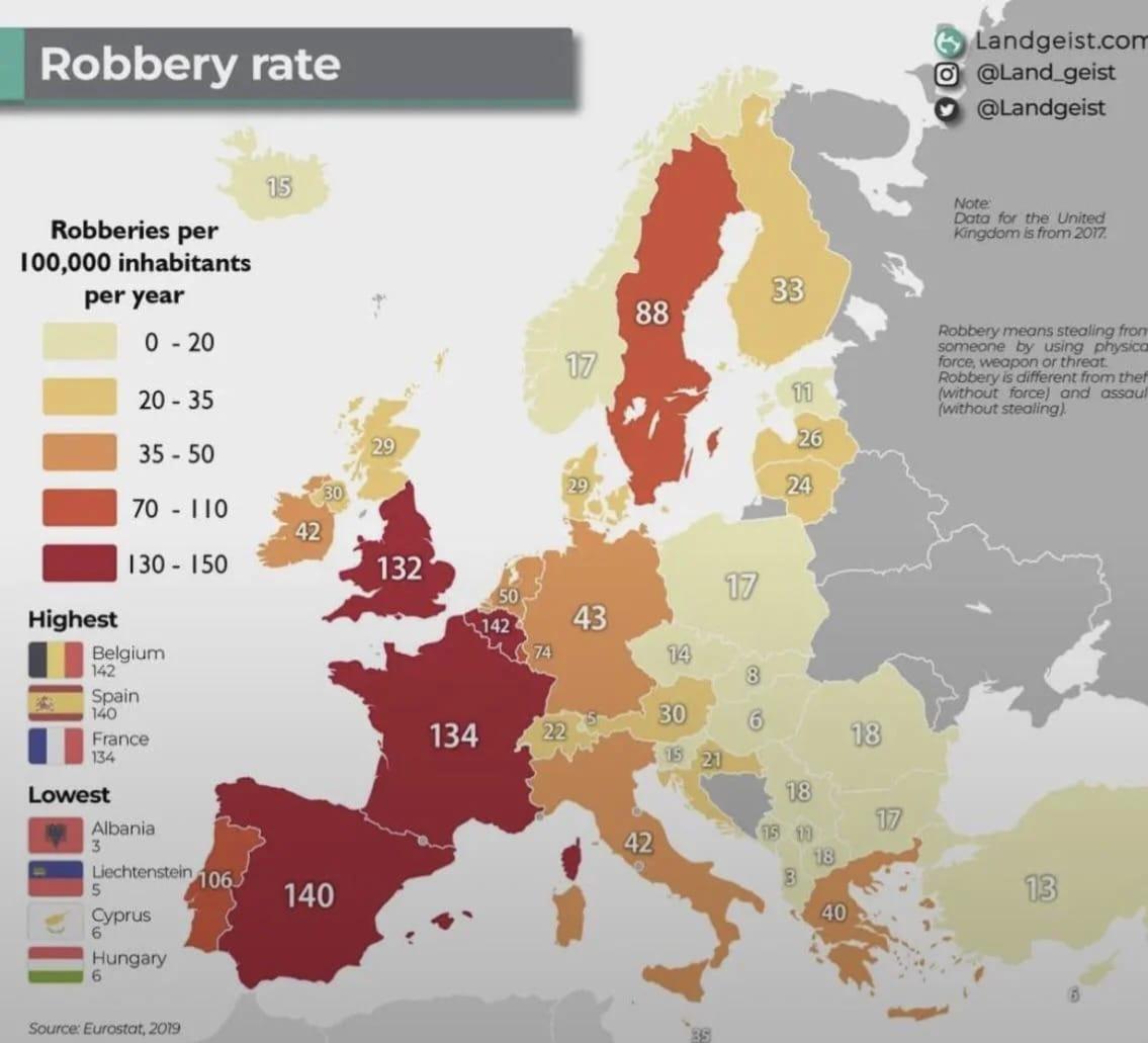 These maps are meaningless. Different countries classify robberies differently, numbers do not correlate. Most robberies in Western countries would be counted as theft in Eastern European countries