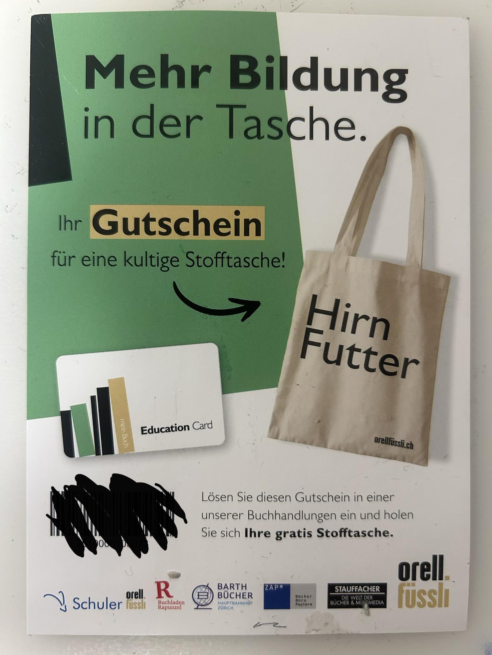 Ich bin Student und habe mich für die Orell Füssli Bildungskarte angemeldet, mit der ich 20 % Rabatt auf Bücher etc. bekomme. Als meine physische Karte ankam, lag ihr ein Gutschein für eine Tasche bei. Da ich keins brauche, gebe ich es einfach weg. Den Gutschein versende ich per B-Post.