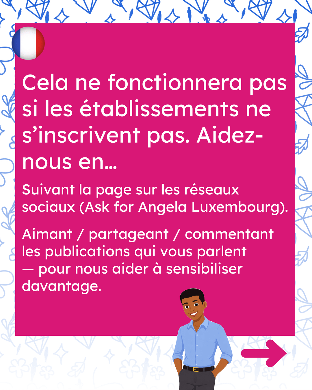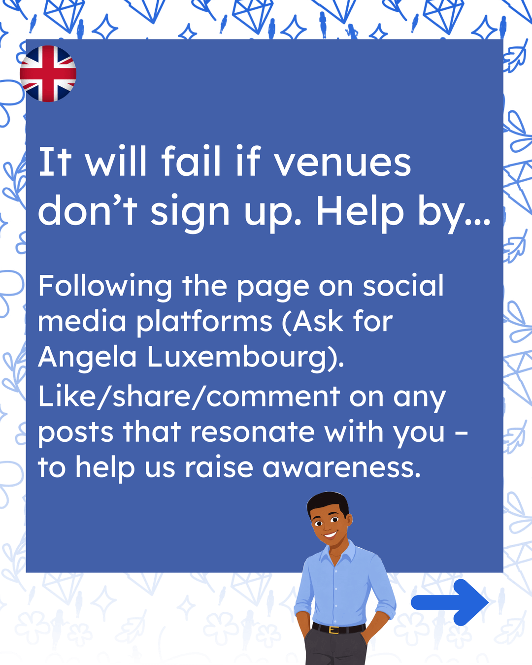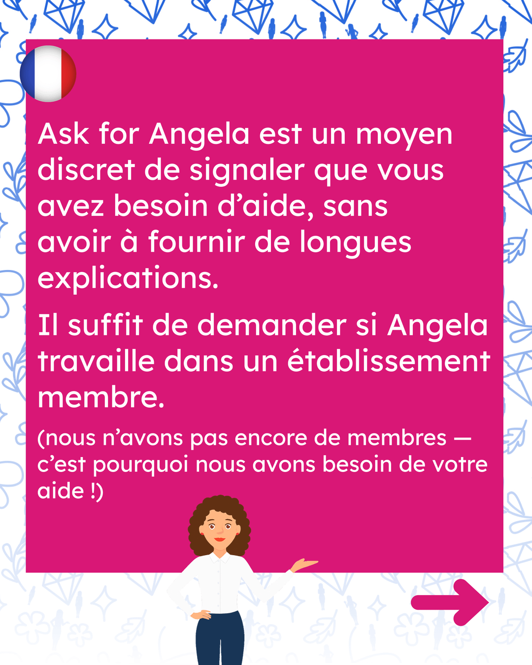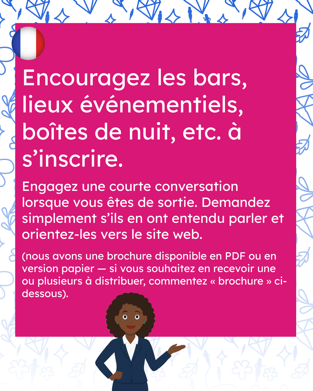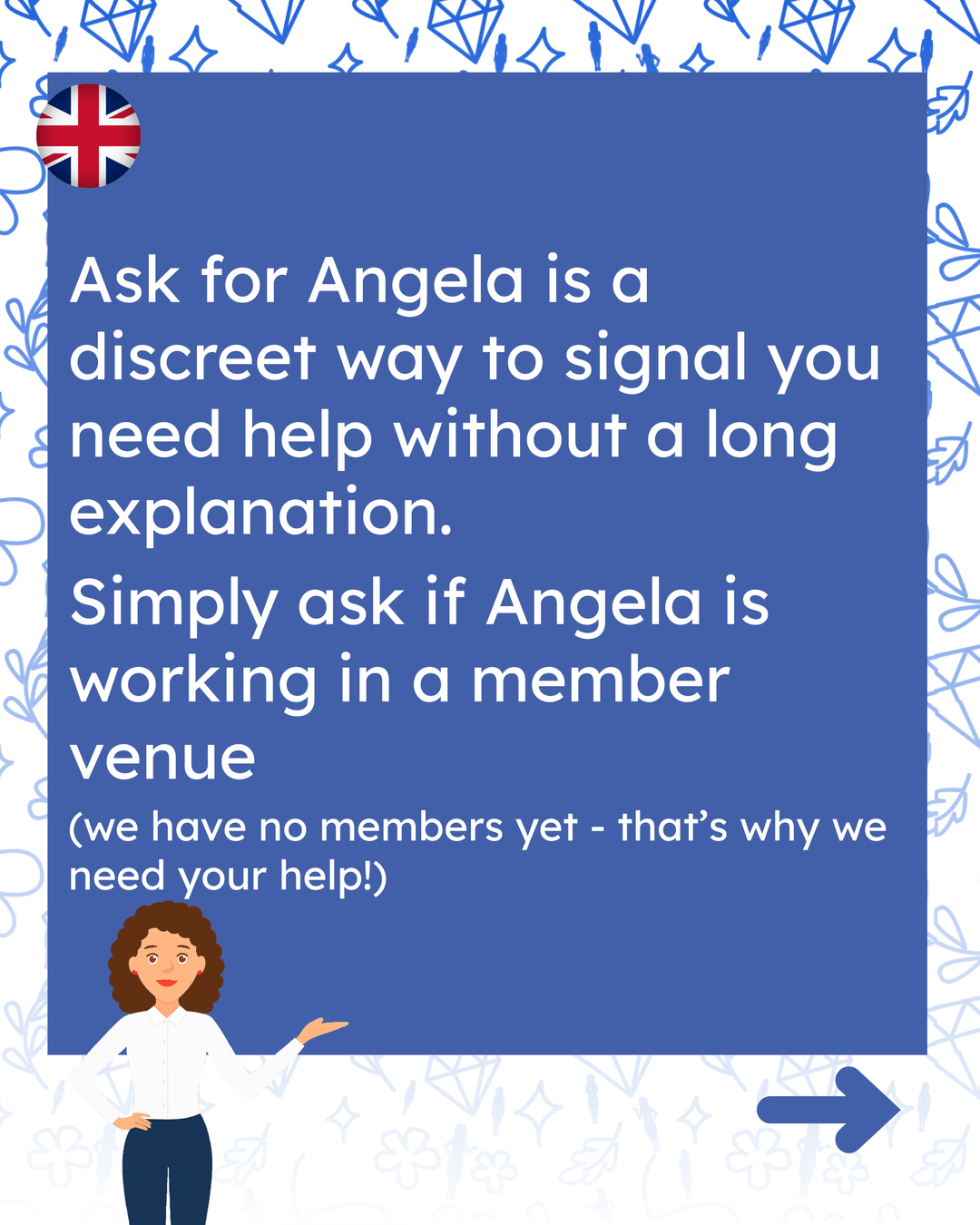 - Wenn Sie mit den Mitarbeitern in Bars, Cafés, Nachtclubs usw. freundlich sind, ermutigen Sie sie zum Beitritt – wir haben viele Informationen in unseren sozialen Medien Fragen Sie nach der Angela-Websiteund in der Broschüre für Veranstaltungsorte